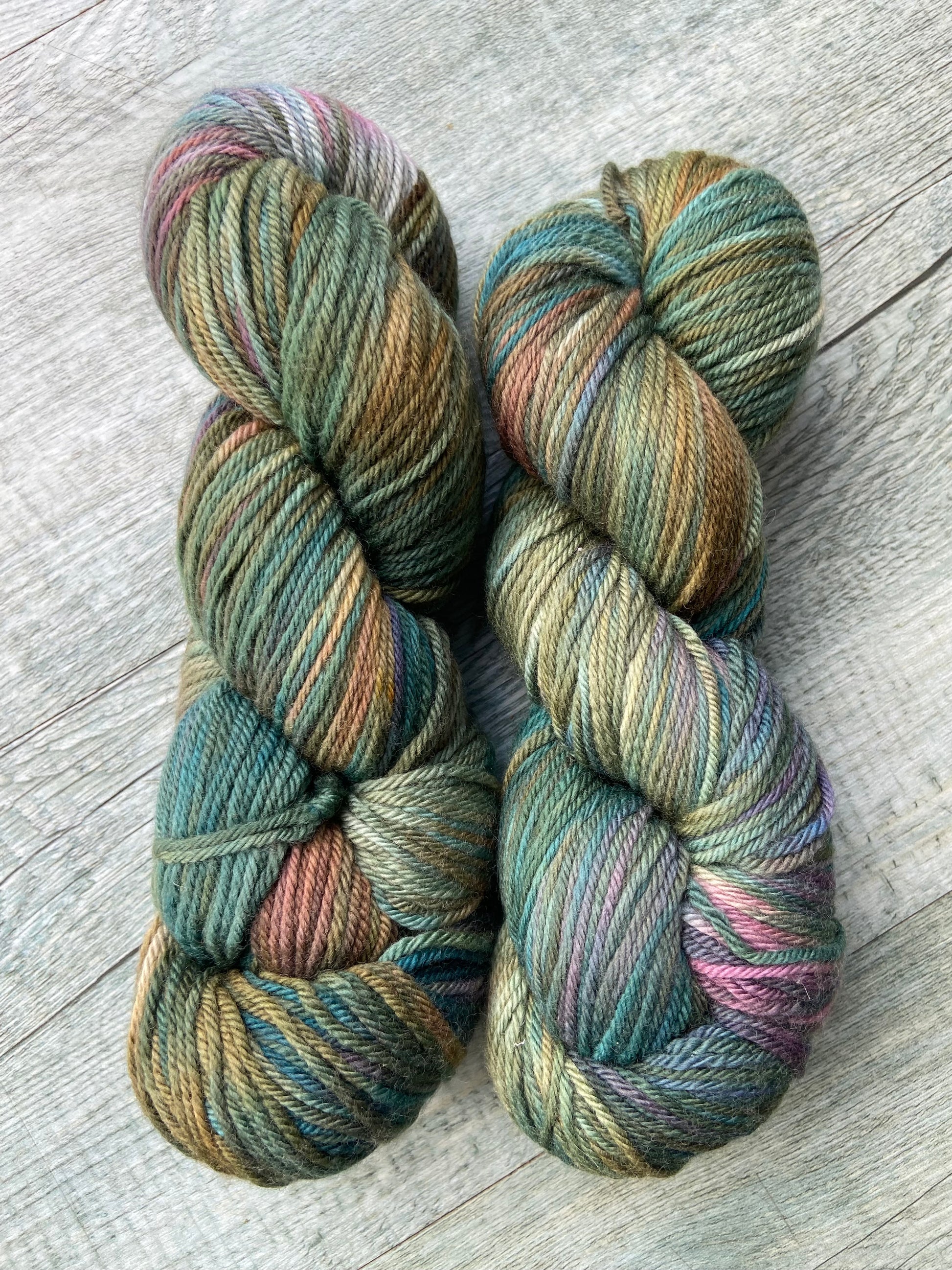 Produced in super soft, New Merino, this yarn is delightful to work with and produces a beautiful mottled fabric with the predominant colour of green.