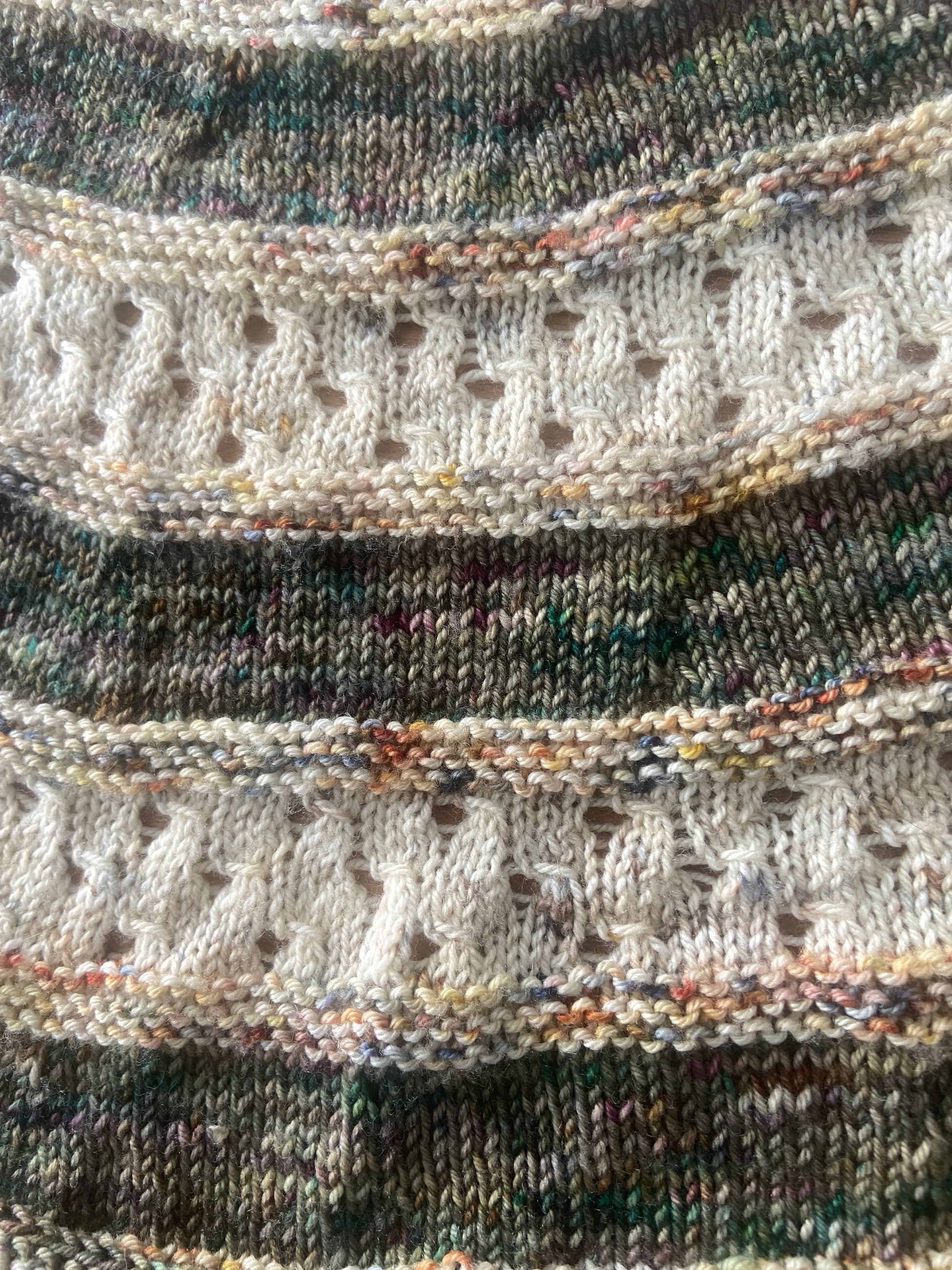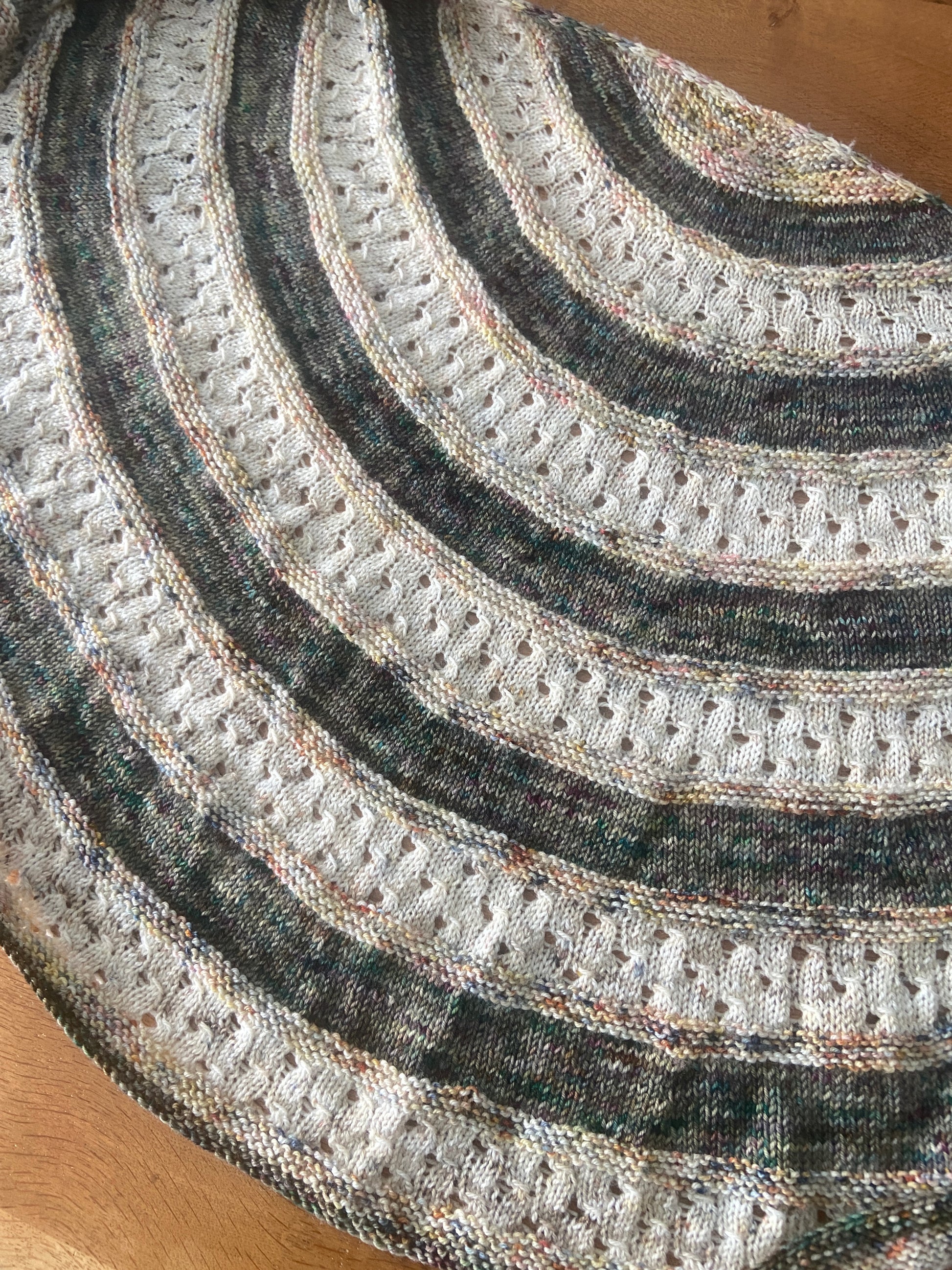 This is a luxurious semi circular shawl made with three distinct 100g colours in bold stripes using 4ply/sock yarn. It has a couple of easy techniques that create a fun and interesting knit, with three main elements. The shawl grows quite quickly, make sure you have a long needle! This uses easy techniques, however the “peanut stitch” is particularly fun, we recommend that you test this on a bit of scrap yarn first. There is no need to tension this shawl.