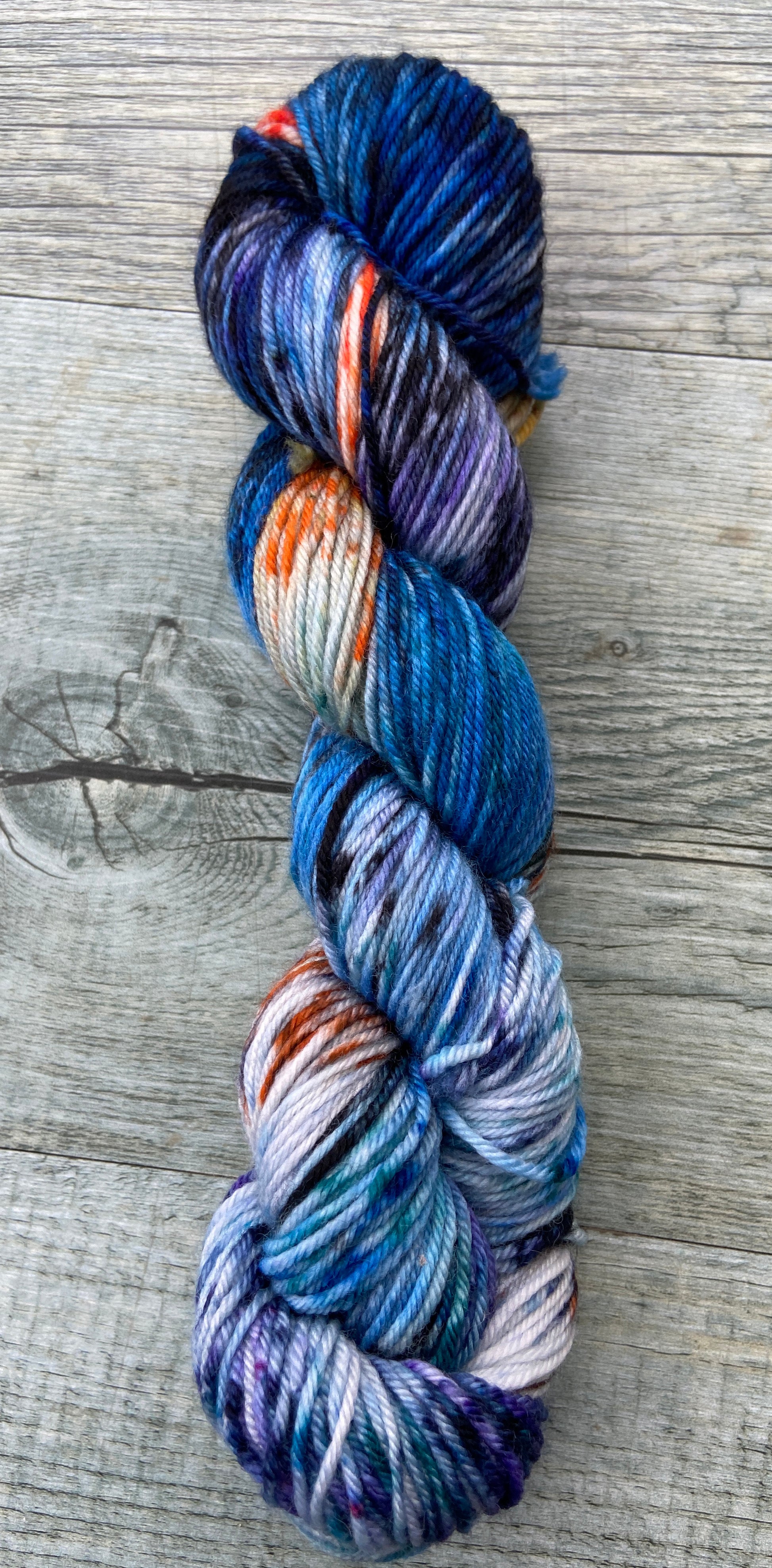 Produced in super soft, New Merino, this yarn is delightfully soft to work with and produces a beautiful speckled fabric with the predominant colour of blues and oranges, like a dramatic evening sunset.