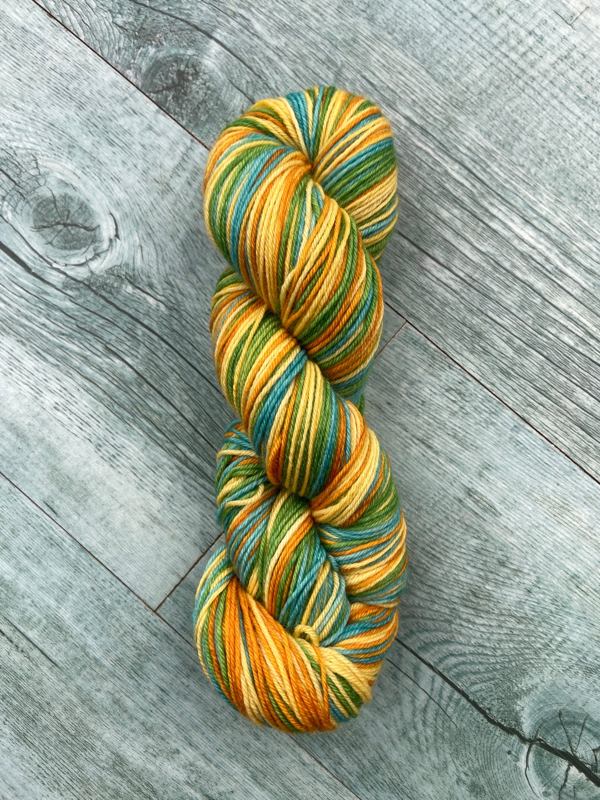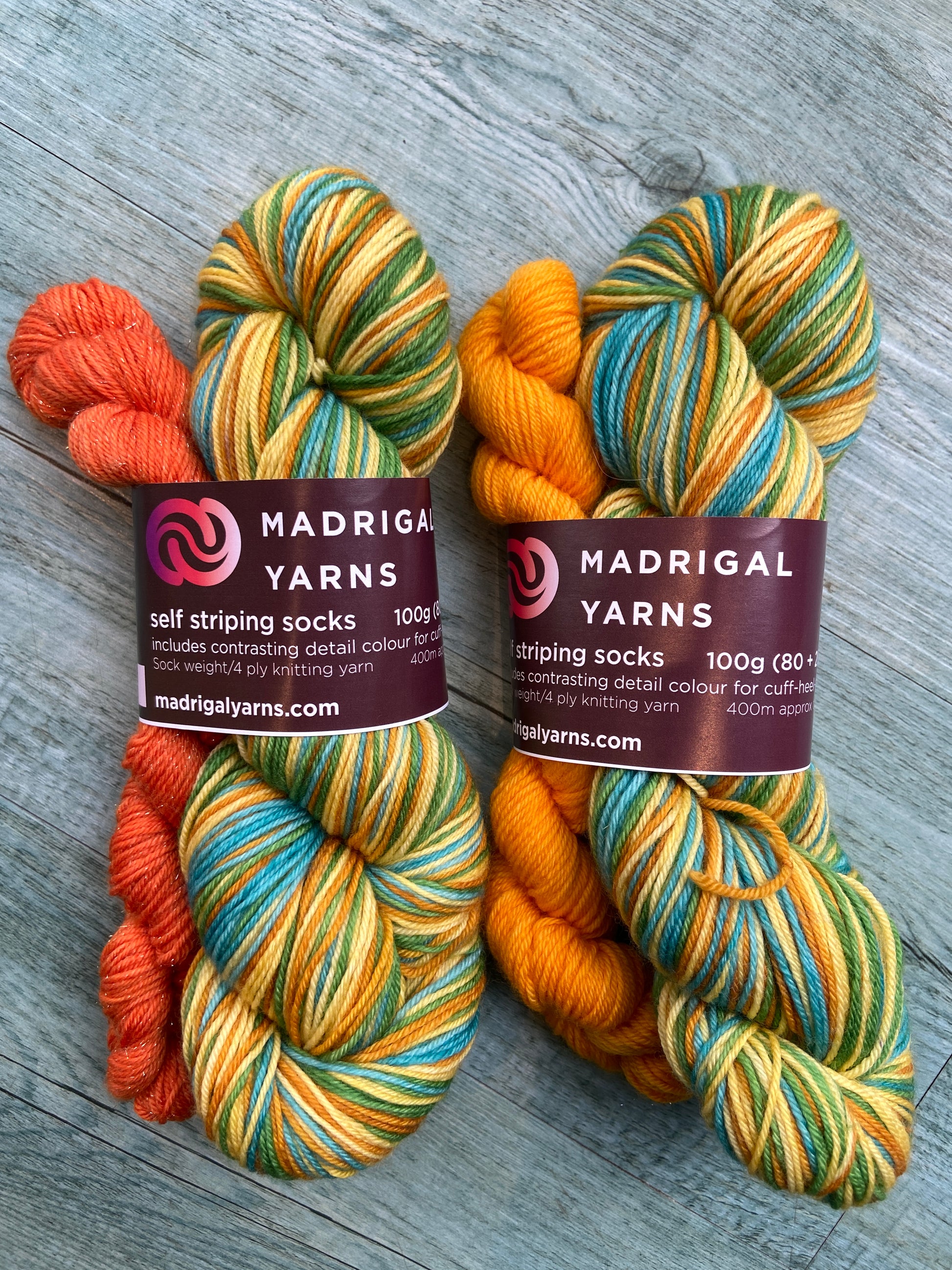 Please note that this kit is 80g of self striping sock yarn and 20g of white for the cuff heel toe details. Other variations of detail colour available soon.