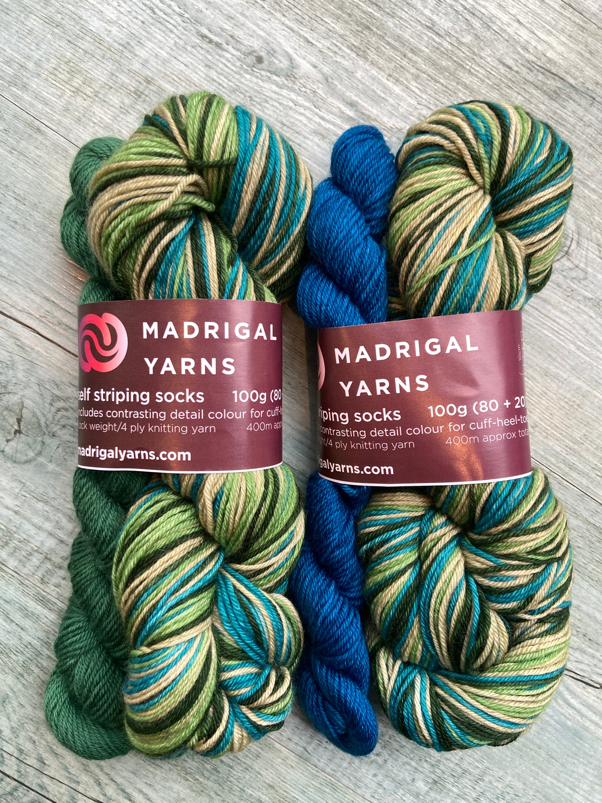 Please note that this kit is 80g of self striping sock yarn and 20g of white for the cuff heel toe details. Other variations of detail colour available soon.