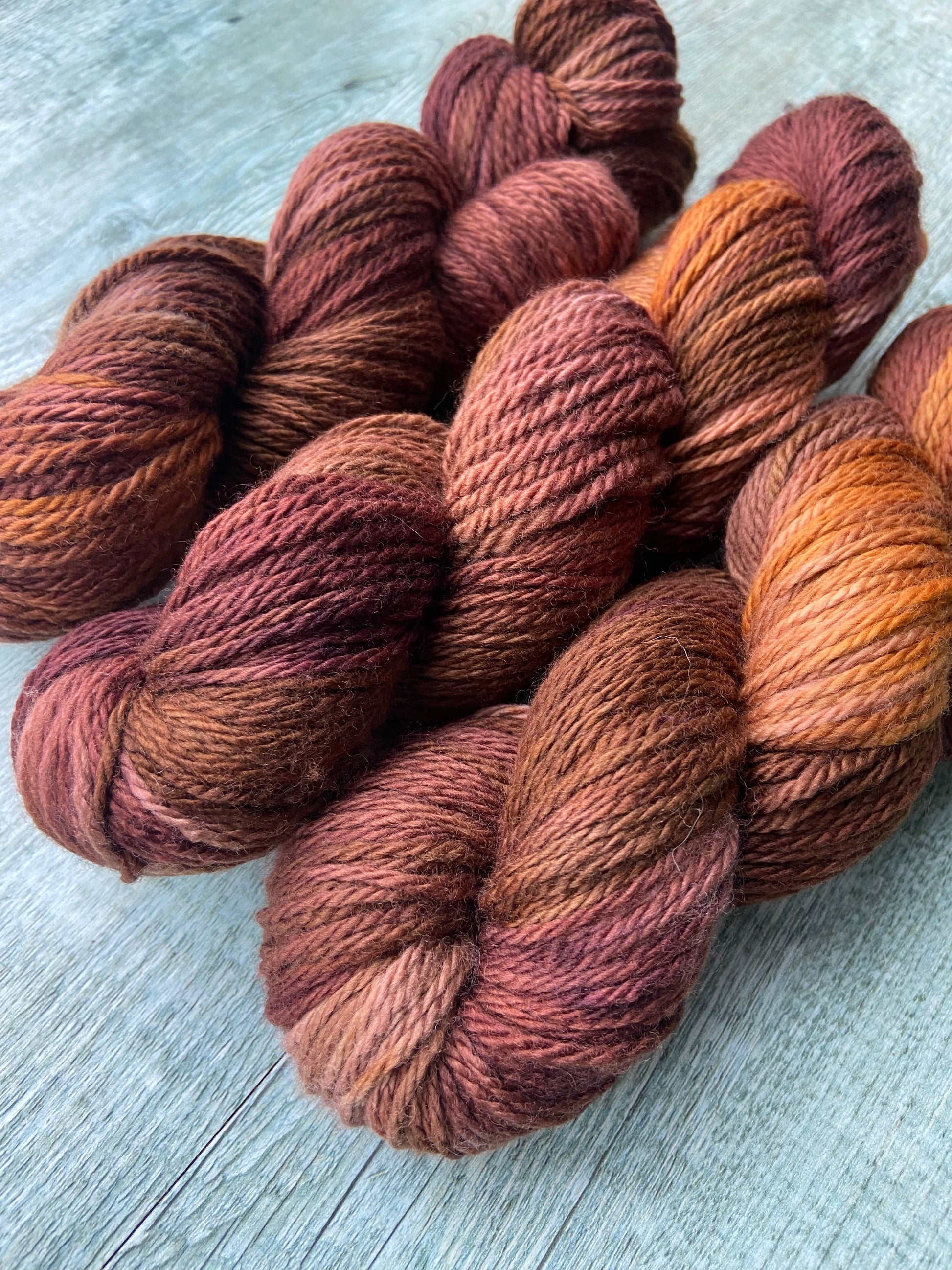 Like a rich warm library with a burning fire, these rich hues ignite with added salmon and orange and tan. beautiful for sweaters and accessories.