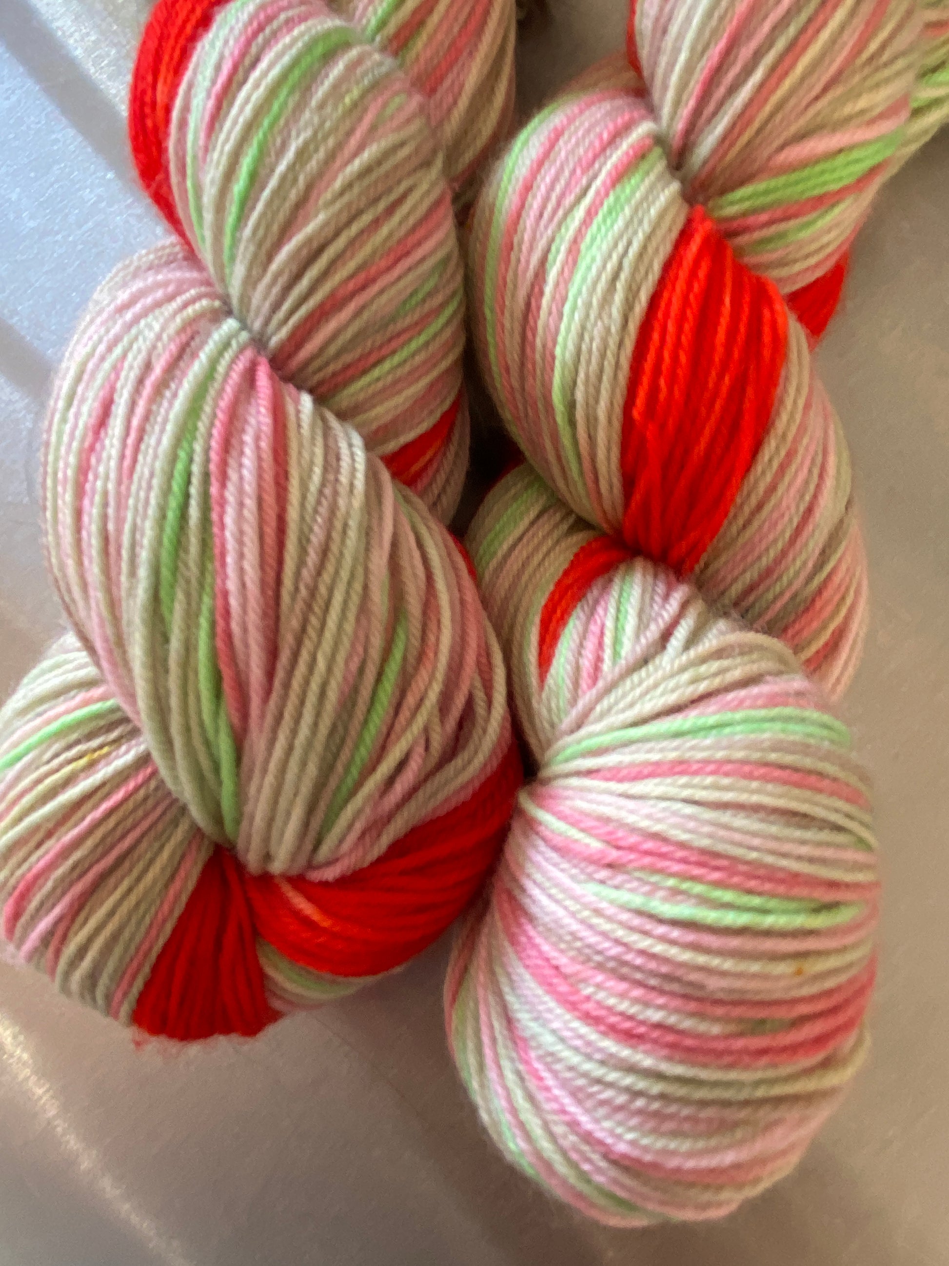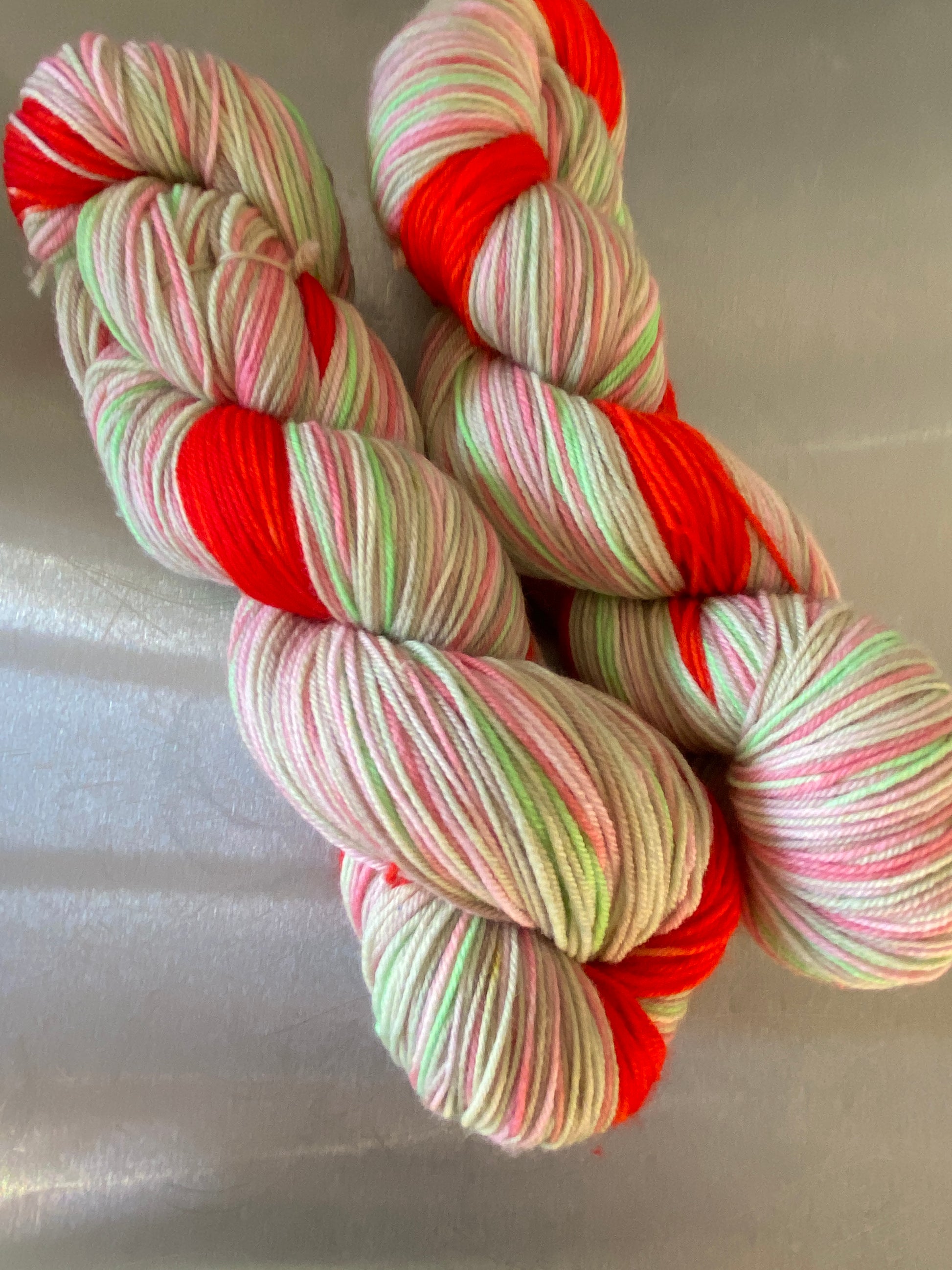 Each unit contains enough yarn to make 2 medium sized long socks. For optimal stripe, we recommend you use 2.5mm DPN’sand a maximum of 60 stitches. The yarn will yield 30 pattern repeats, enough for 16 on each sock. Included is a contrasting yet complementary colour for the Cuff-heel-toe detail should you want to snazzy the whole thing up.