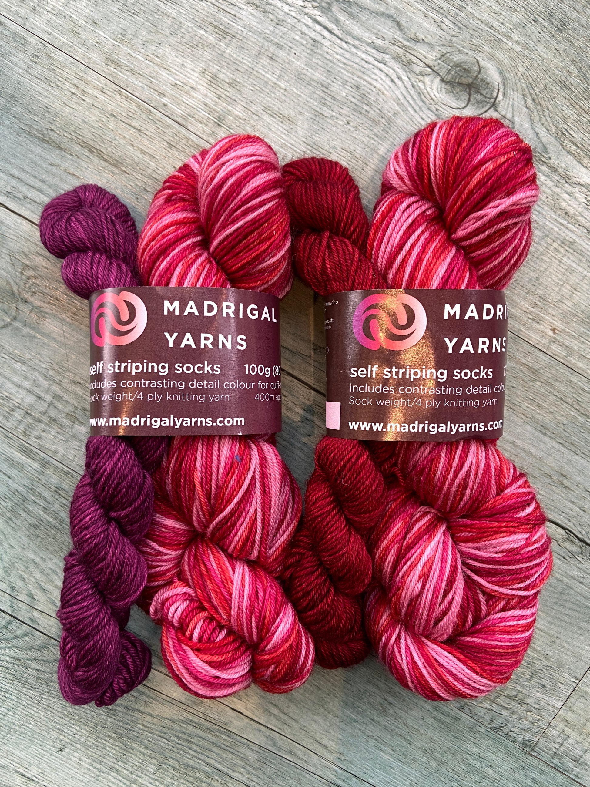 Please note that this kit is 80g of self striping sock yarn and 20g of white for the cuff heel toe details. Other variations of detail colour available soon.