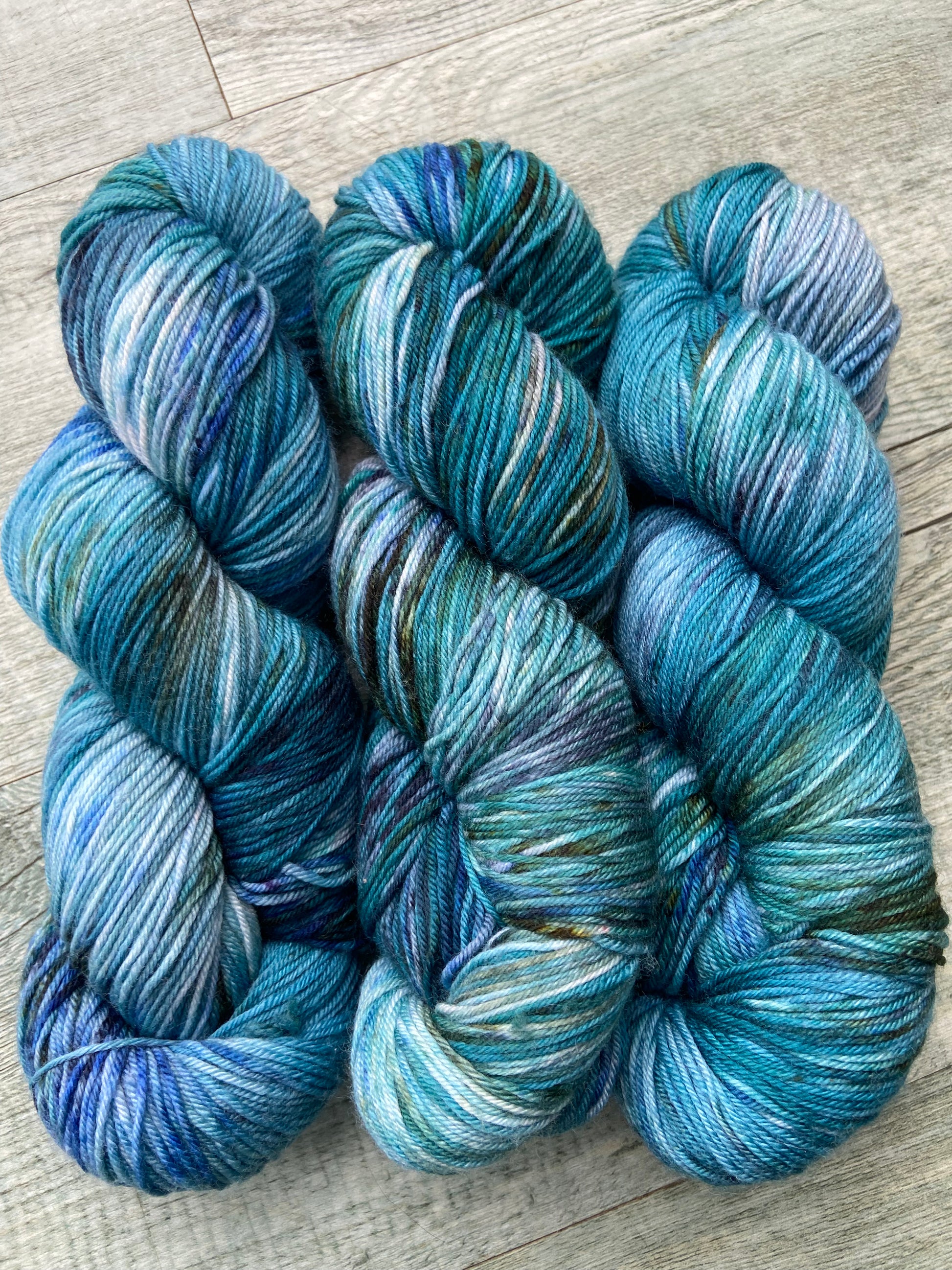 Beautifully Speckled Blue and turquoise coloured yarn in fingering weight with a hint of nylon for structure