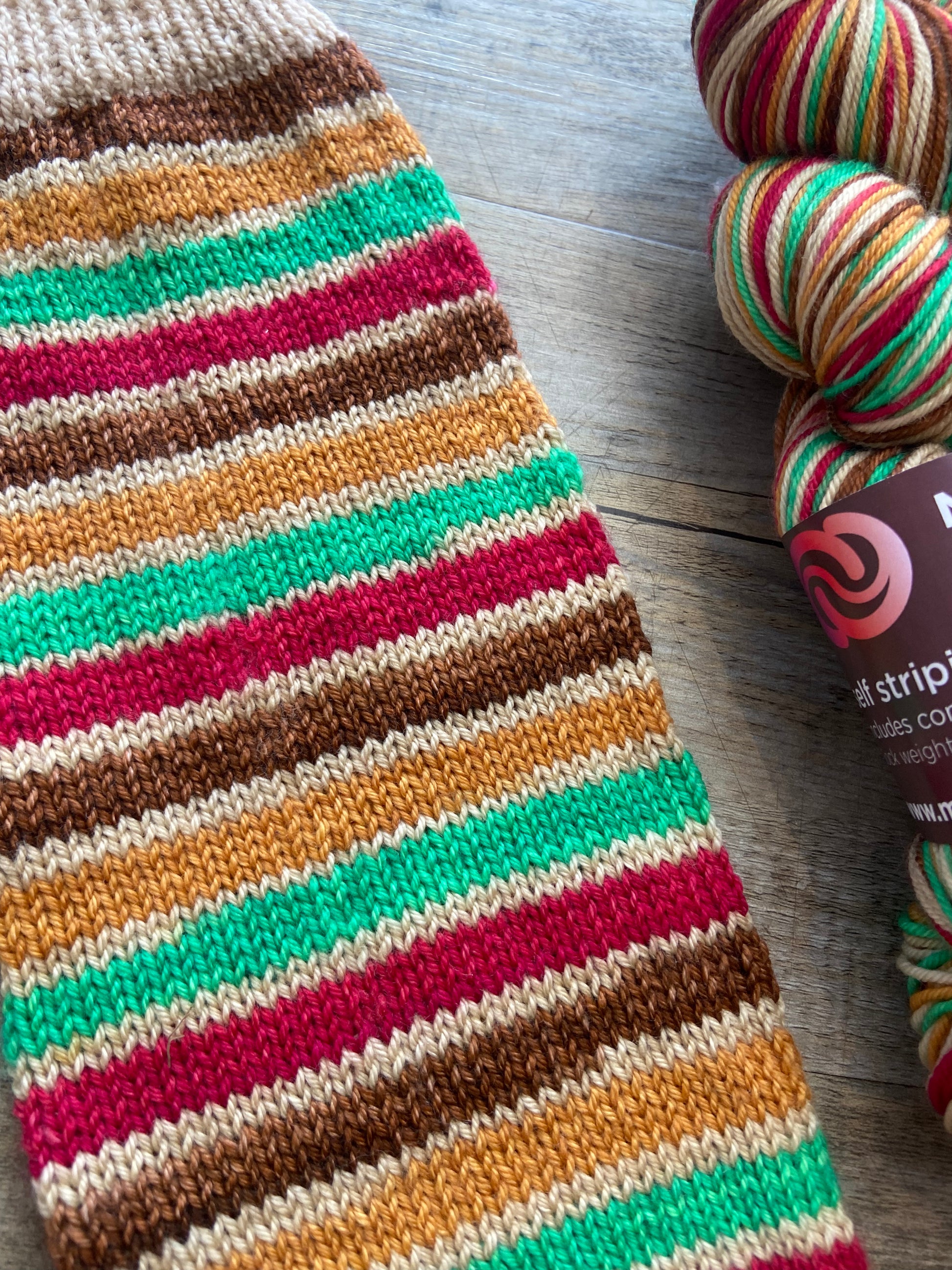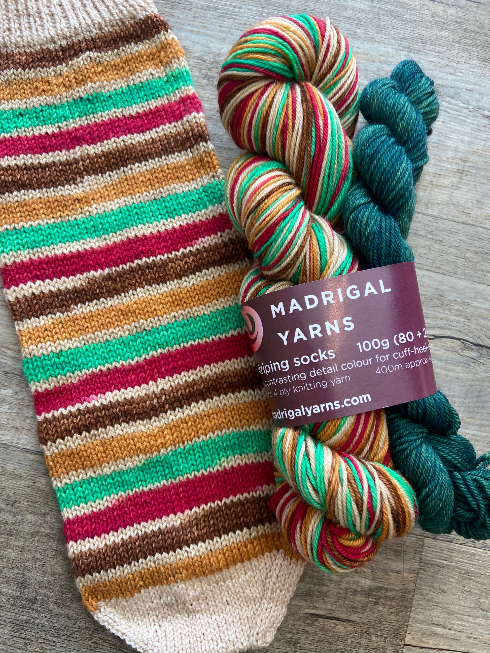 Please note that this kit is 80g of self striping sock yarn and 20g of either Bottle green or white for the cuff heel toe details.