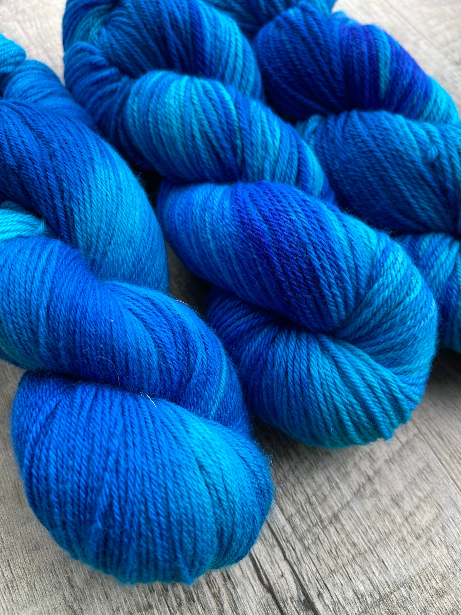 Produced in super soft Merino, this yarn is delightful to work with and produces a beautiful mottled fabric with the predominant colour of blue.