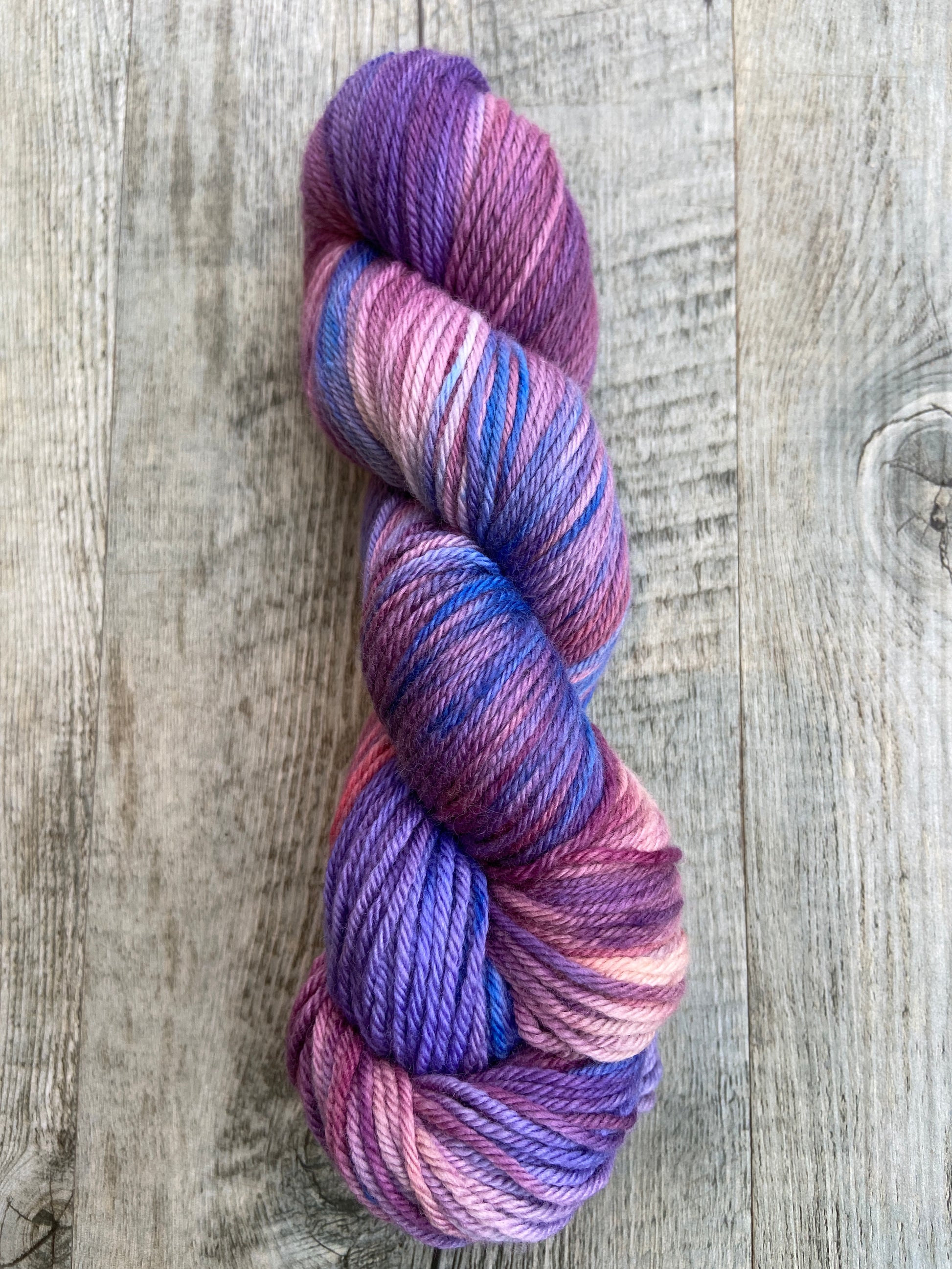 Produced in super soft, ethically farmed and mulesing free Merino, this yarn is delightful to work with and produces a beautiful mottled fabric with the predominant colour of violet, pink and blue.