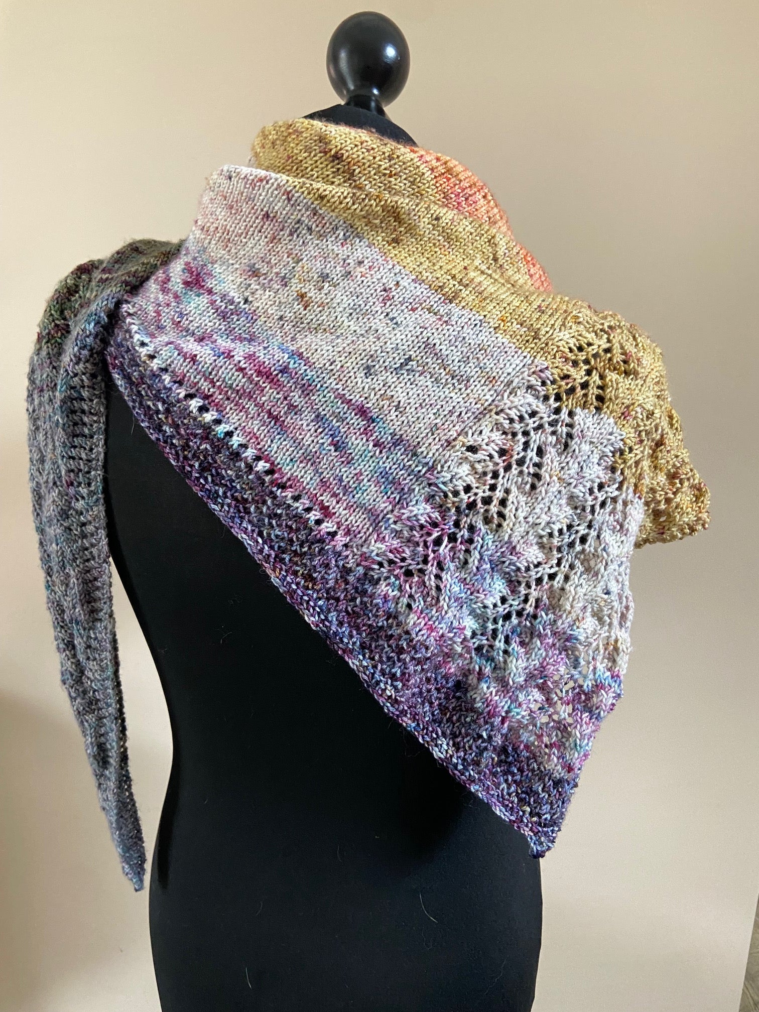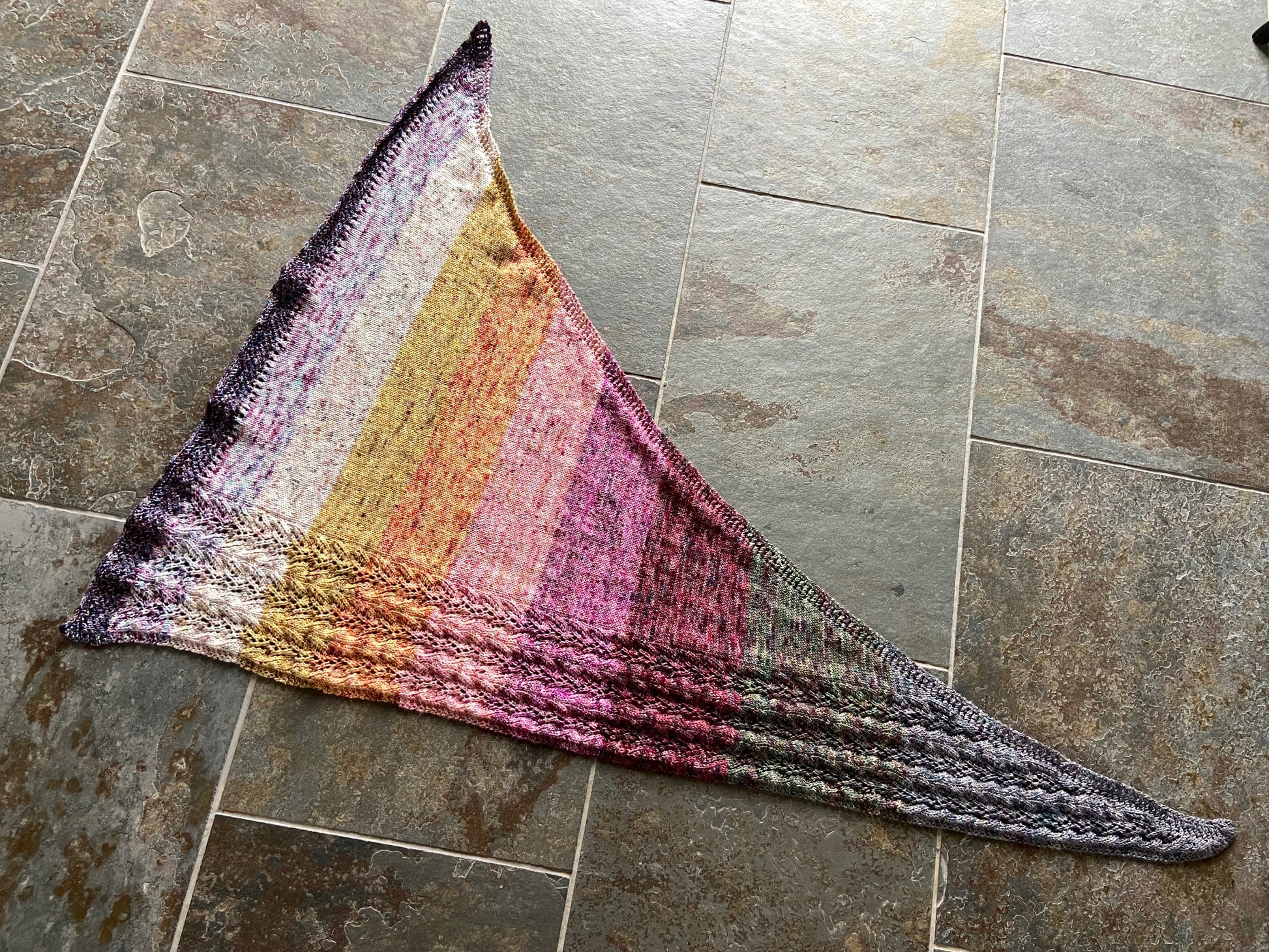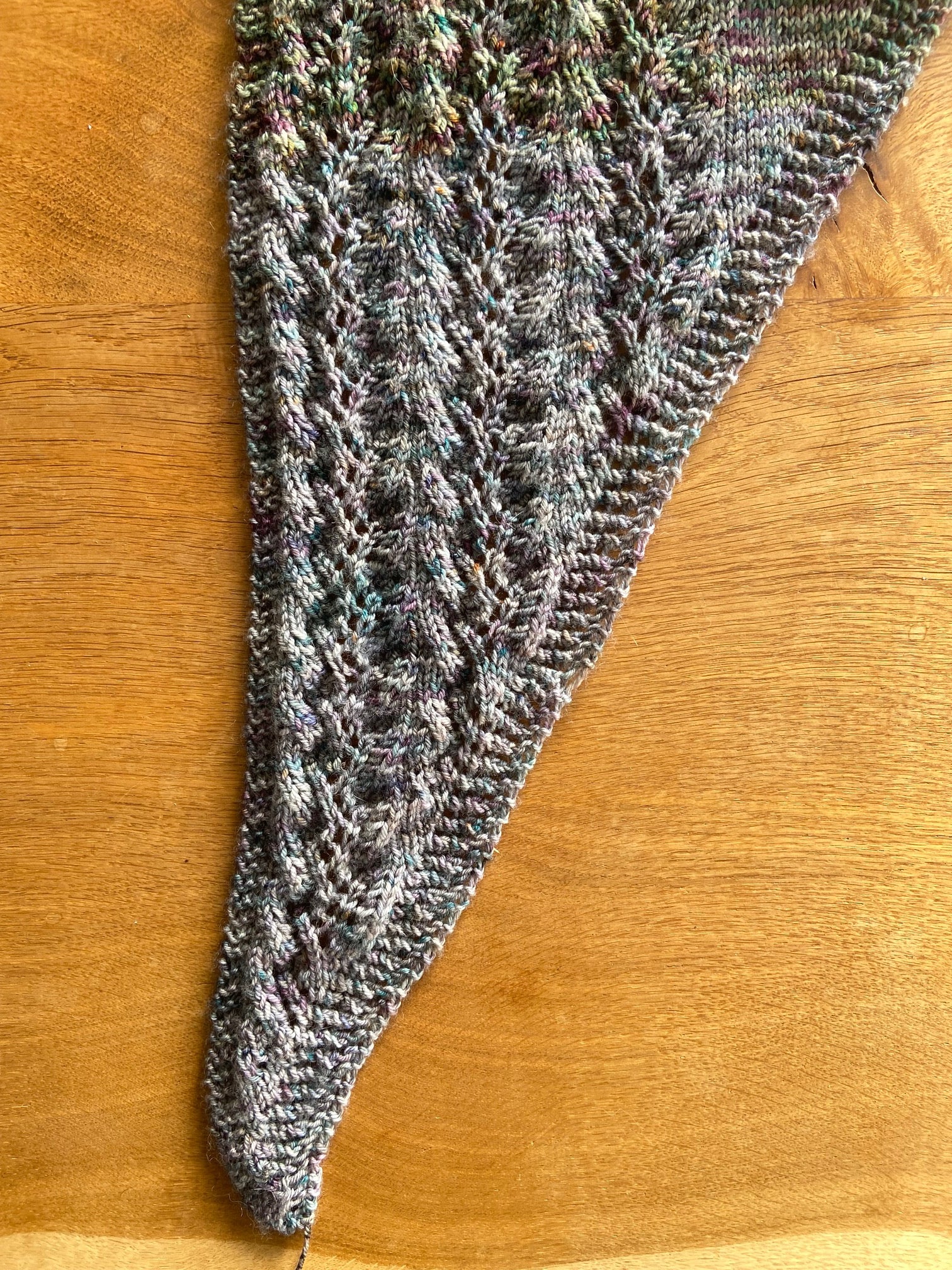This is a light and summery, lacy triangular shaped shawl with a simple increase at one end of every RS row. The edge is a lacy motif knitted in three sections, working with the initial increase. There is an additional lacy border to the increase section which gives it the gothic feeling, and a three stitch garter straight edge to reduce curling. There is no need to tension test this garment, you will knit as far as you can go with each colour.