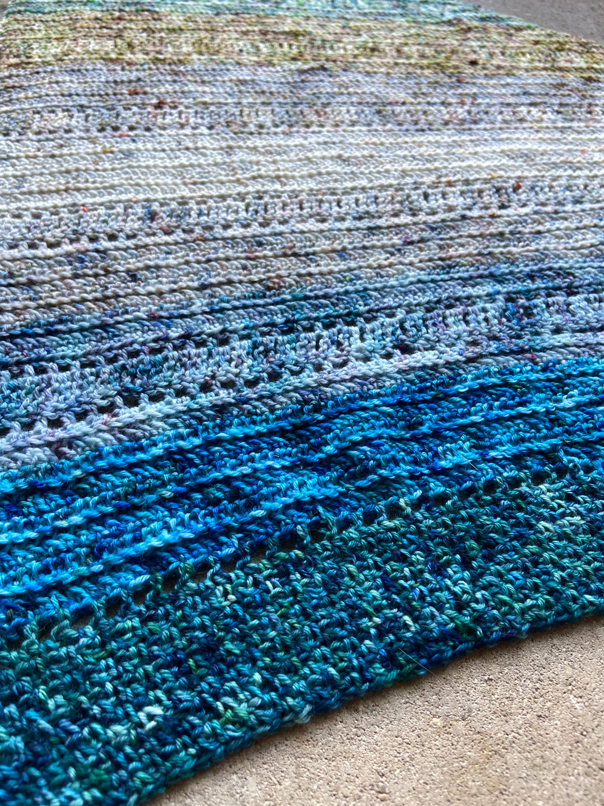 This is a really simple light and summery, triangular shaped shawl with a simple increase at one end every RS row. The variation in colour that is achieved by the mini fade set, is highlighted with textured crochet stitch rows that run through it. It is the crochet companion to the Vactioner Shawl (knitted).