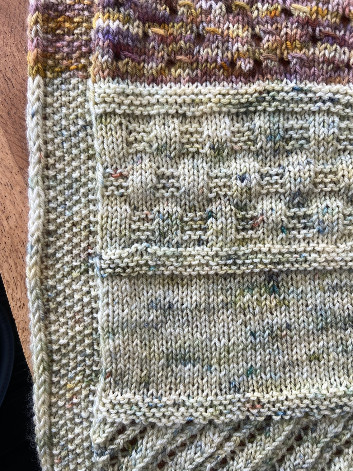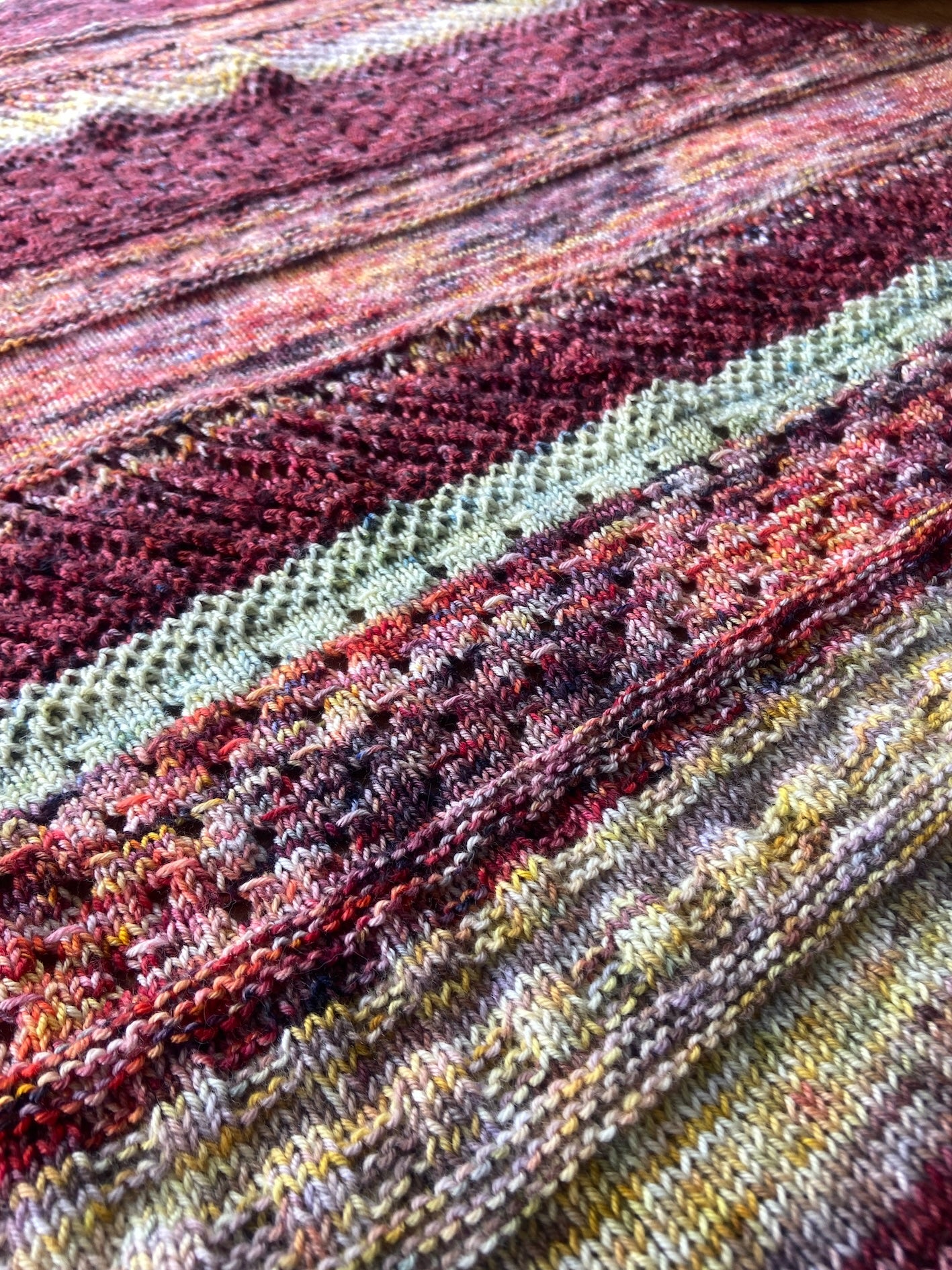 The beast is finally here. This is a very large shawl using 4 x 100g skeins of 4 ply sock yarn, a total of 3200m!