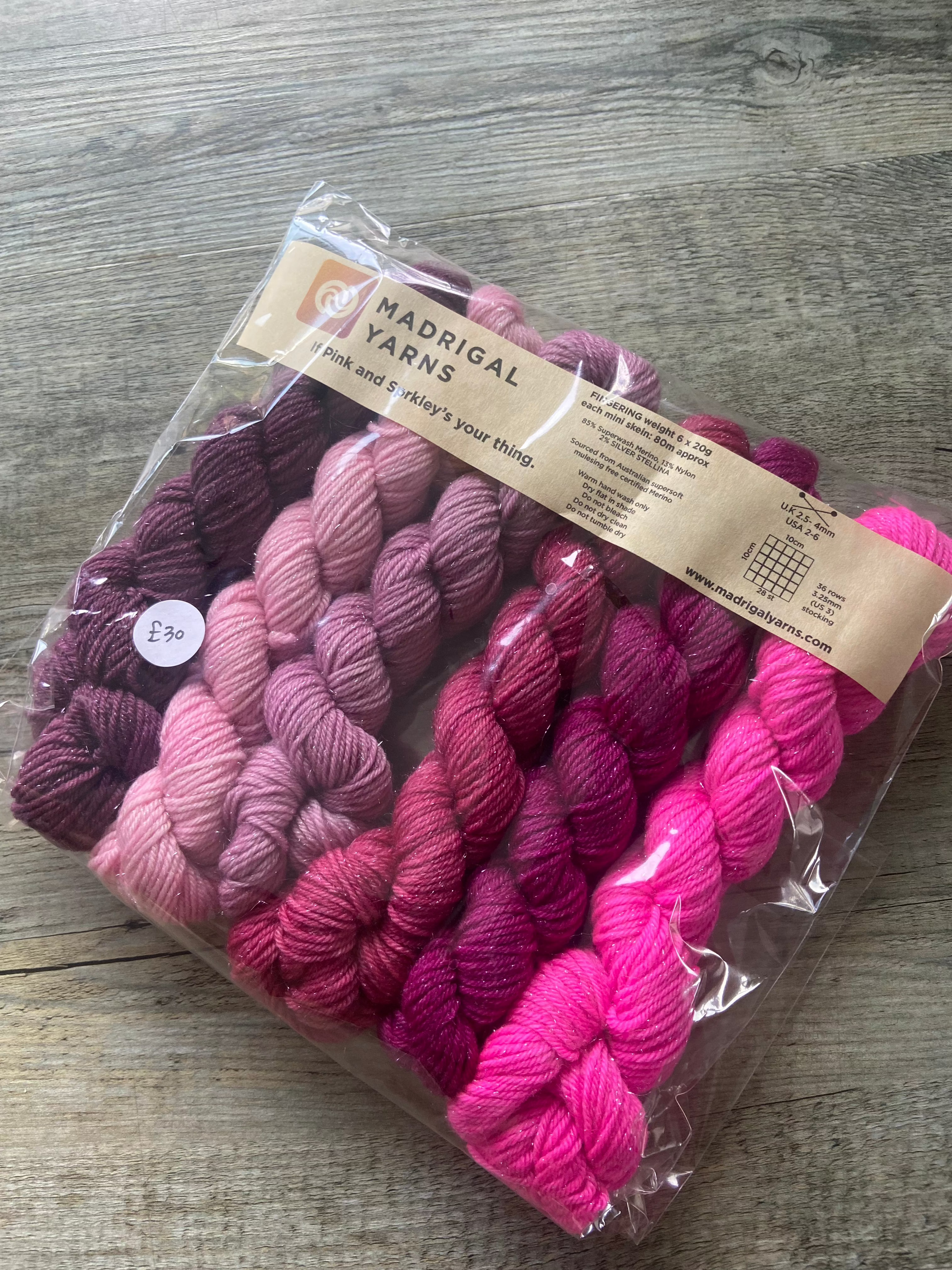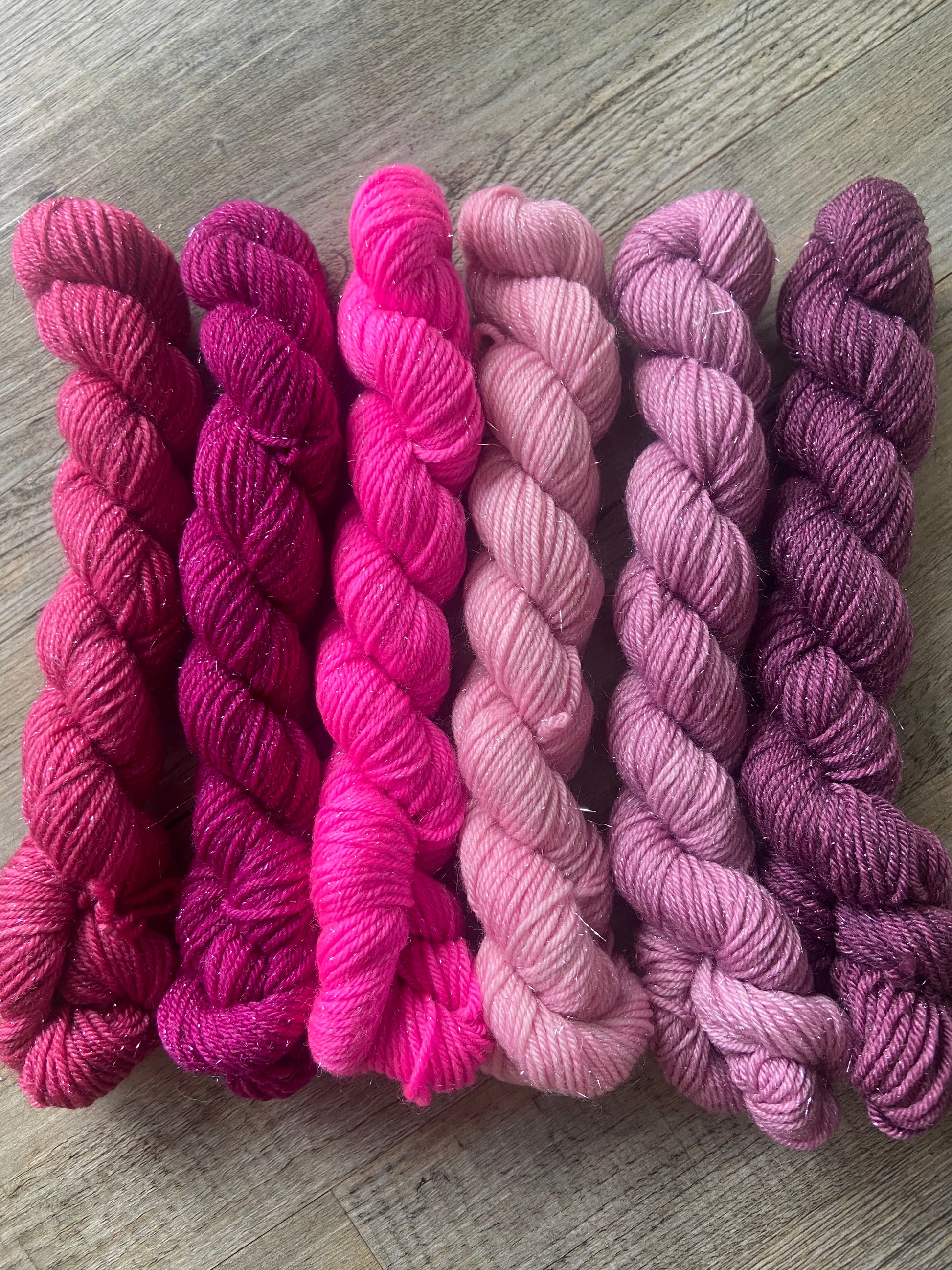 The pack contains 6 x Mini skeins of 75% Superwash Merino, 15% Nylon and 10% Stellina sparkle.