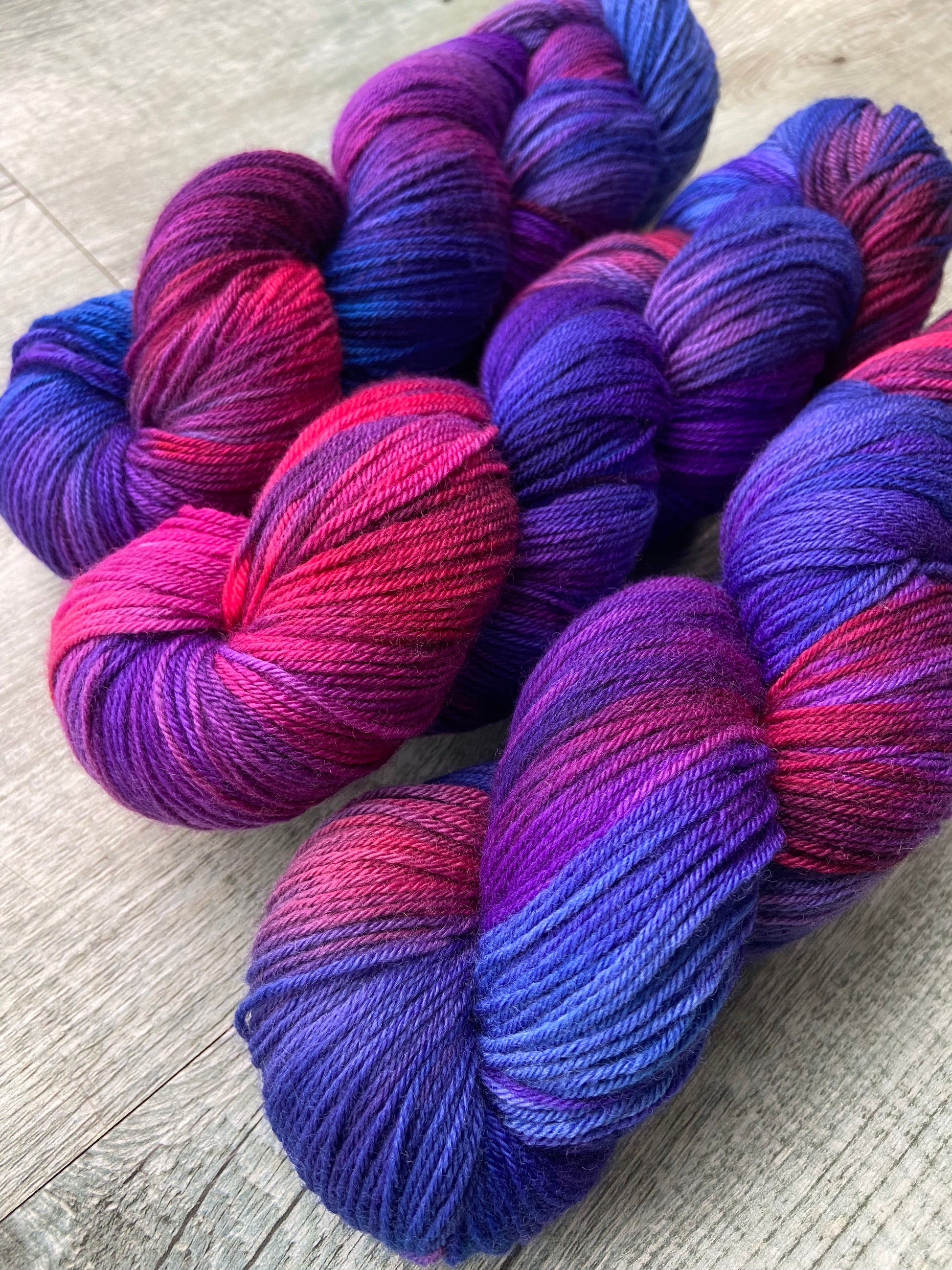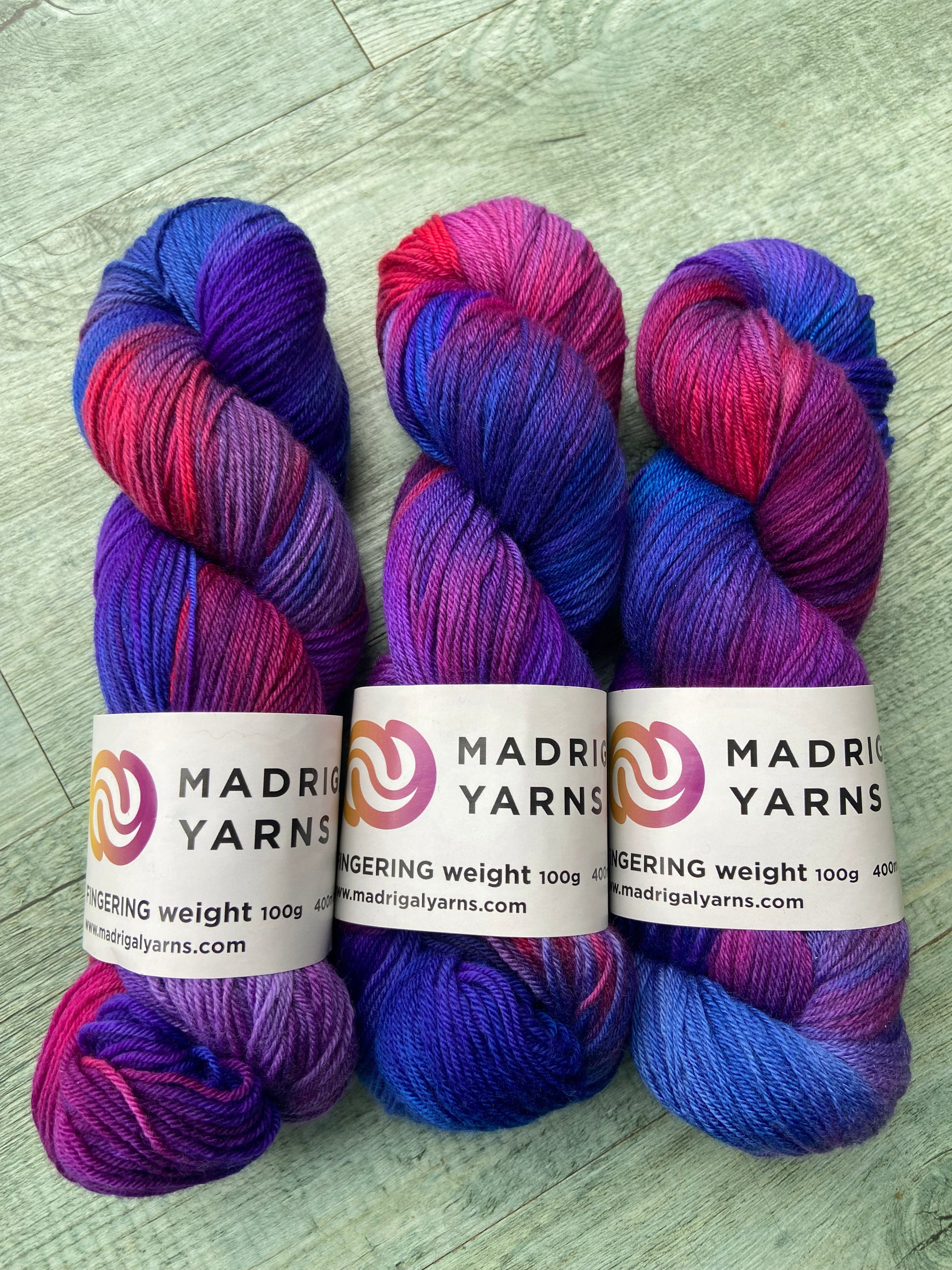 Vibrant rich violet and blues make this a stand out feature yarn for any project where you want to make a big entrance. Beautiful in garments and as lace.