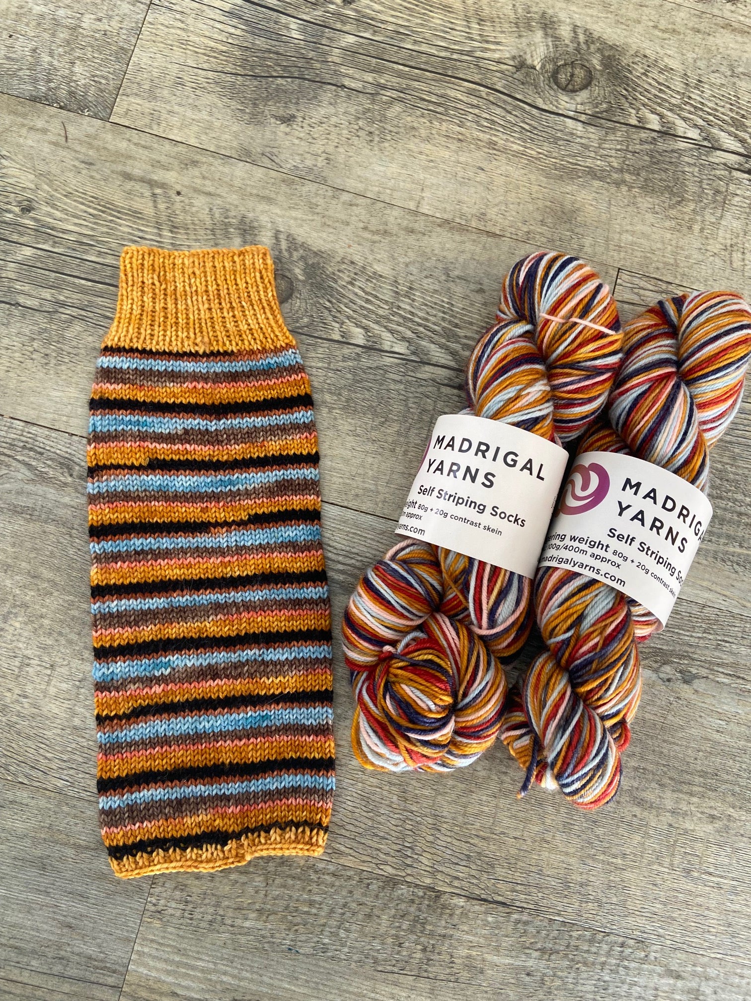 Each unit contains 80g of striping sock yarn - enough yarn to make 2 medium sized long socks. For optimal stripe, we recommend you use 2.5mm needles with typically 56 - 60 stitches. The yarn will yield 30 pattern repeats, enough for 16 on each sock. The product also Includes 20g of a complementary colour for the Cuff-heel-toe detail should you want to snazzy the whole thing up. Total weight 100g.