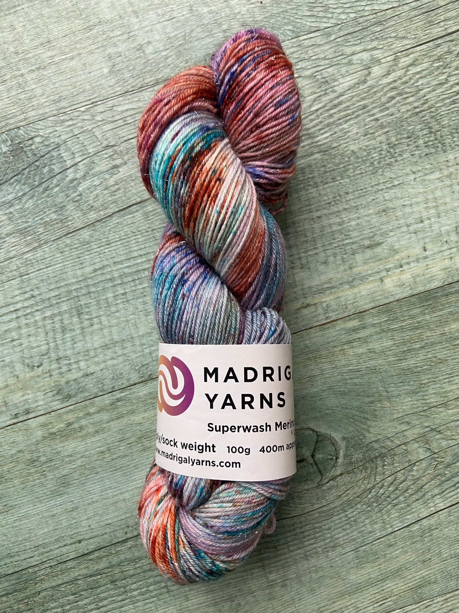 100g 4ply/sock 75% Superwash Merino 15% Nylon 10% Stellina sparkle Dyelot 0851809: QTY IN STOCK: 1