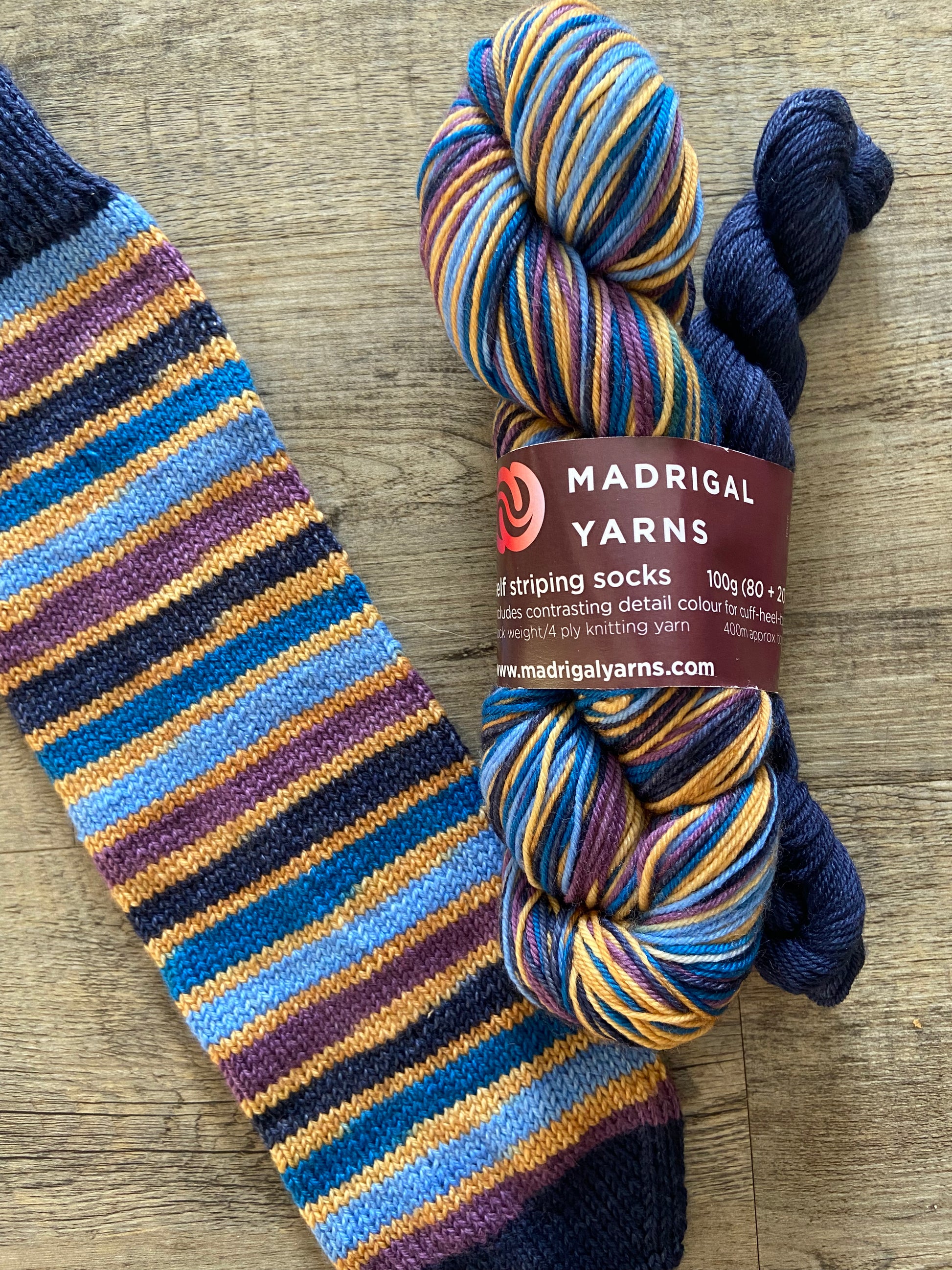 Please note that this kit is 80g of self striping sock yarn and 20g of navy blue for the cuff heel toe details.