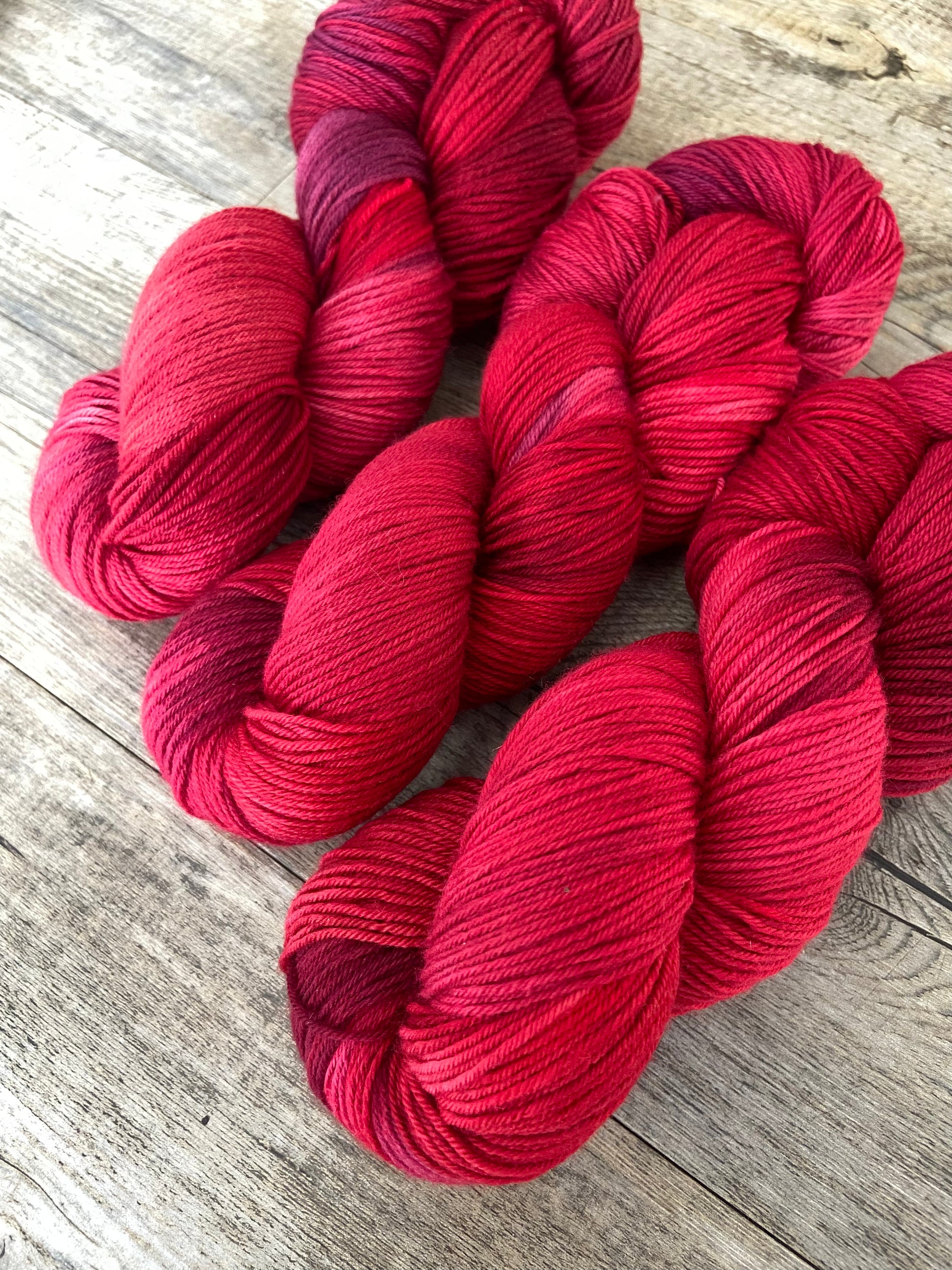 A seductive as a ruby encrusted necklace, this yarn is delightfully rich and sinfully extravagant. Beautiful deep reds produce a gorgeous gem like quality to the fabric. beautiful for any garment or accessory.