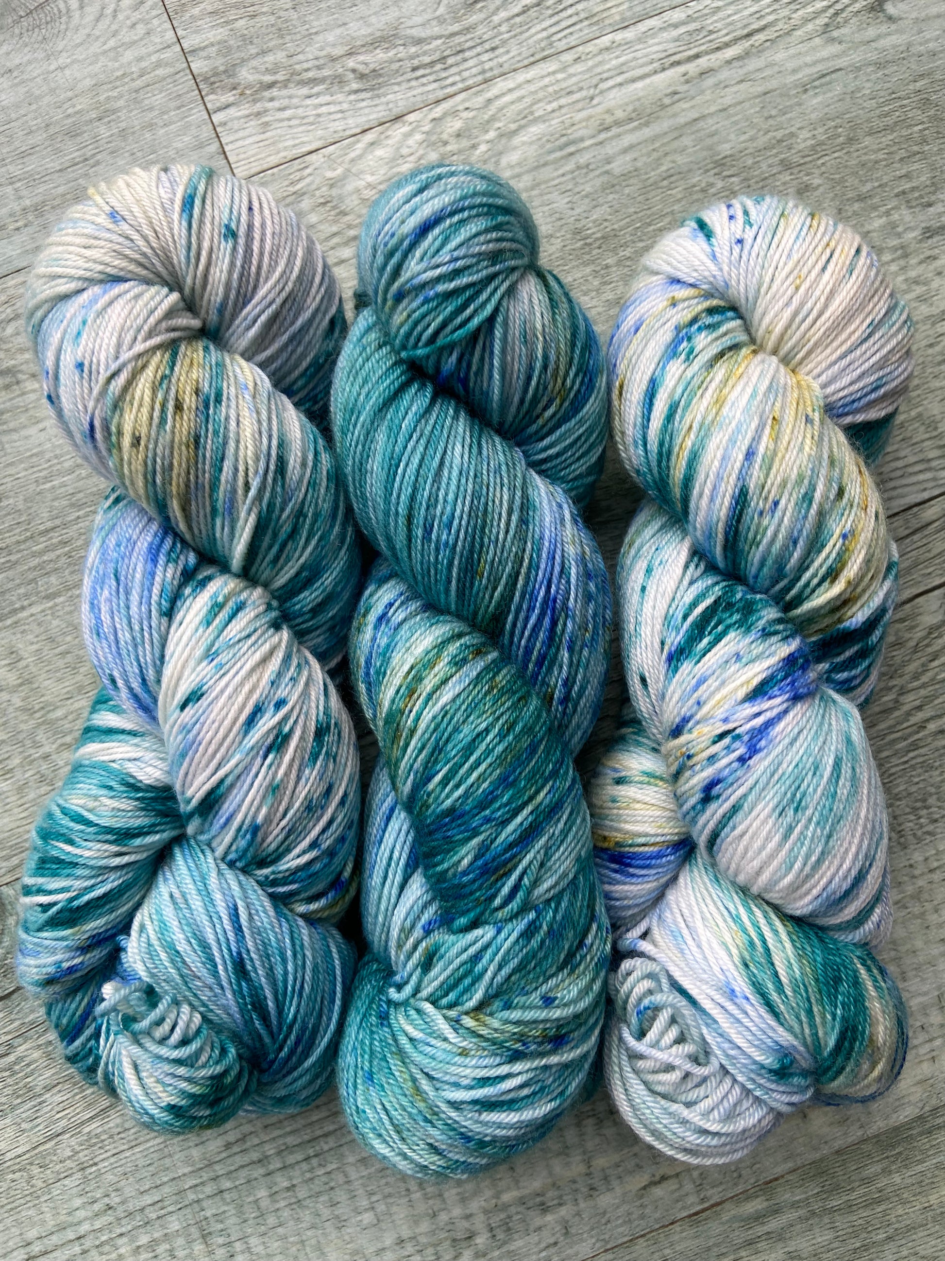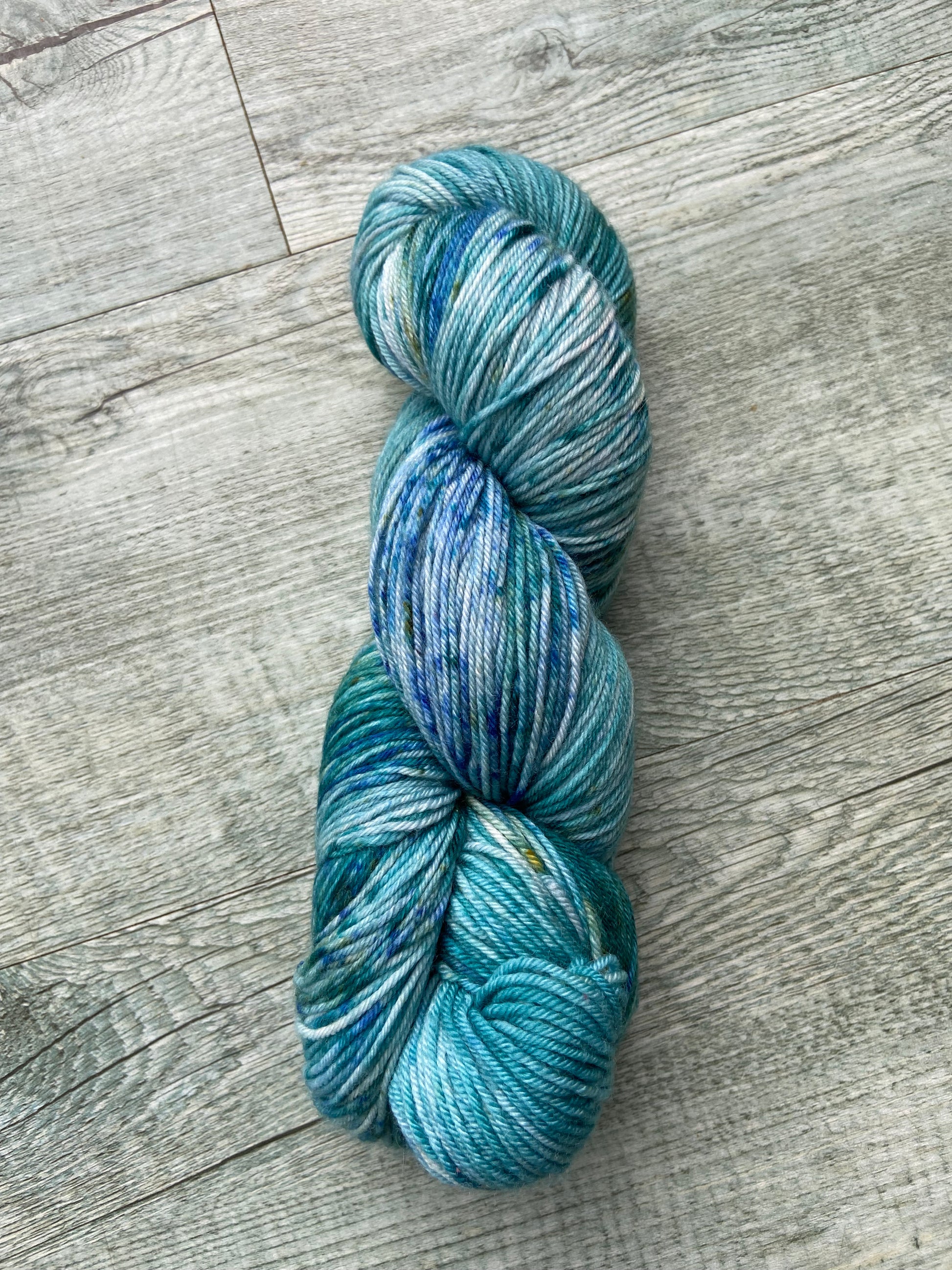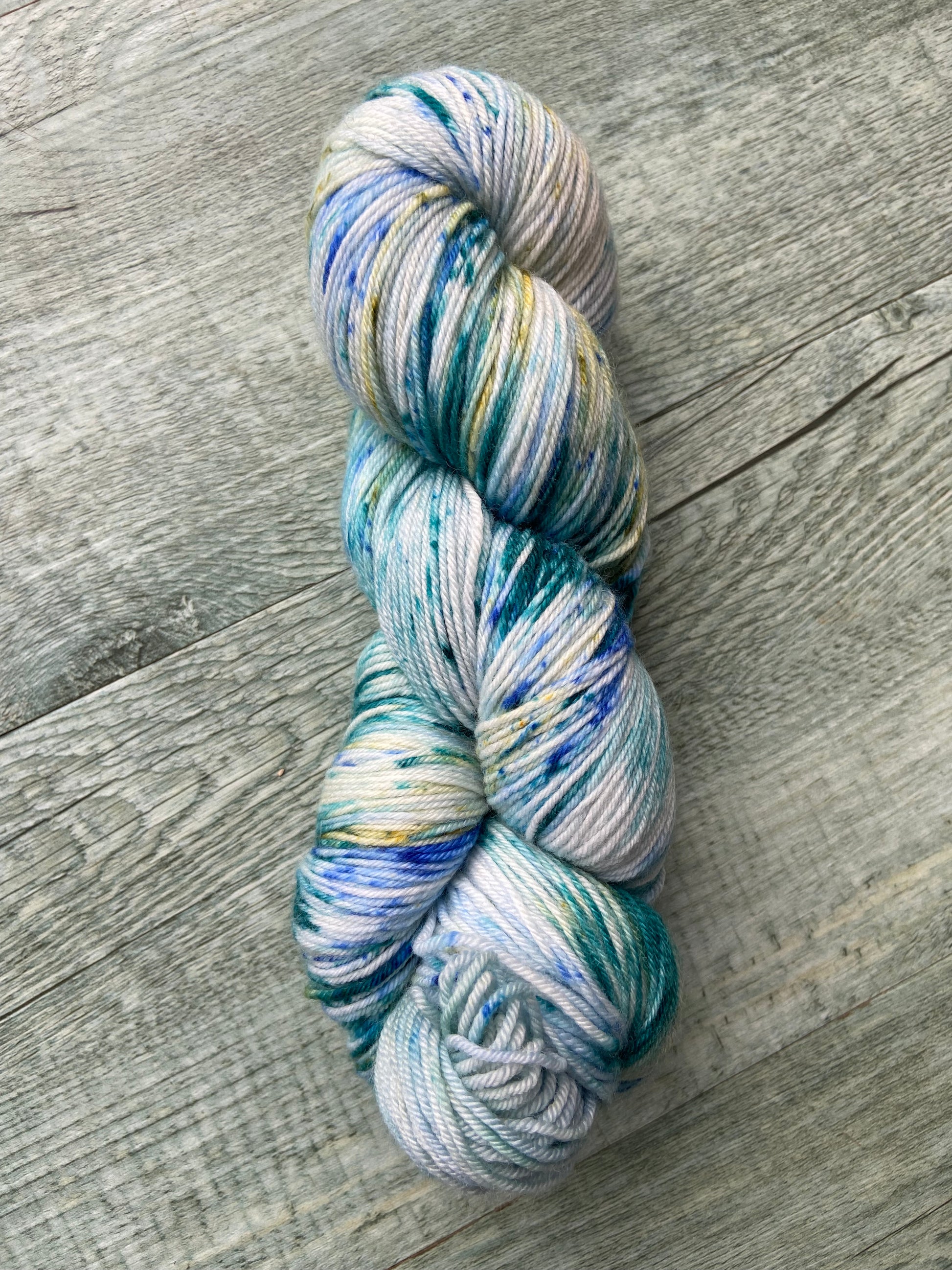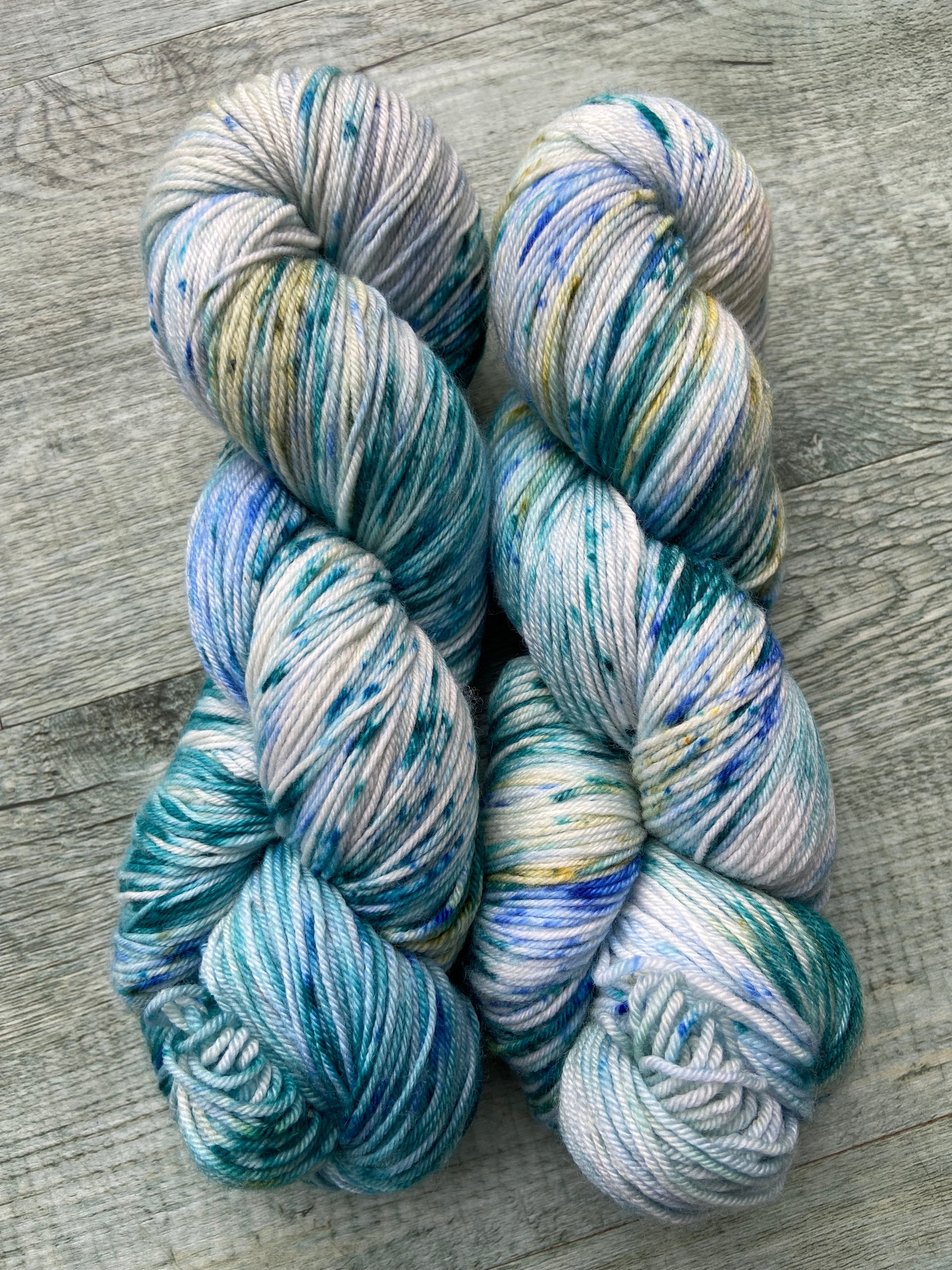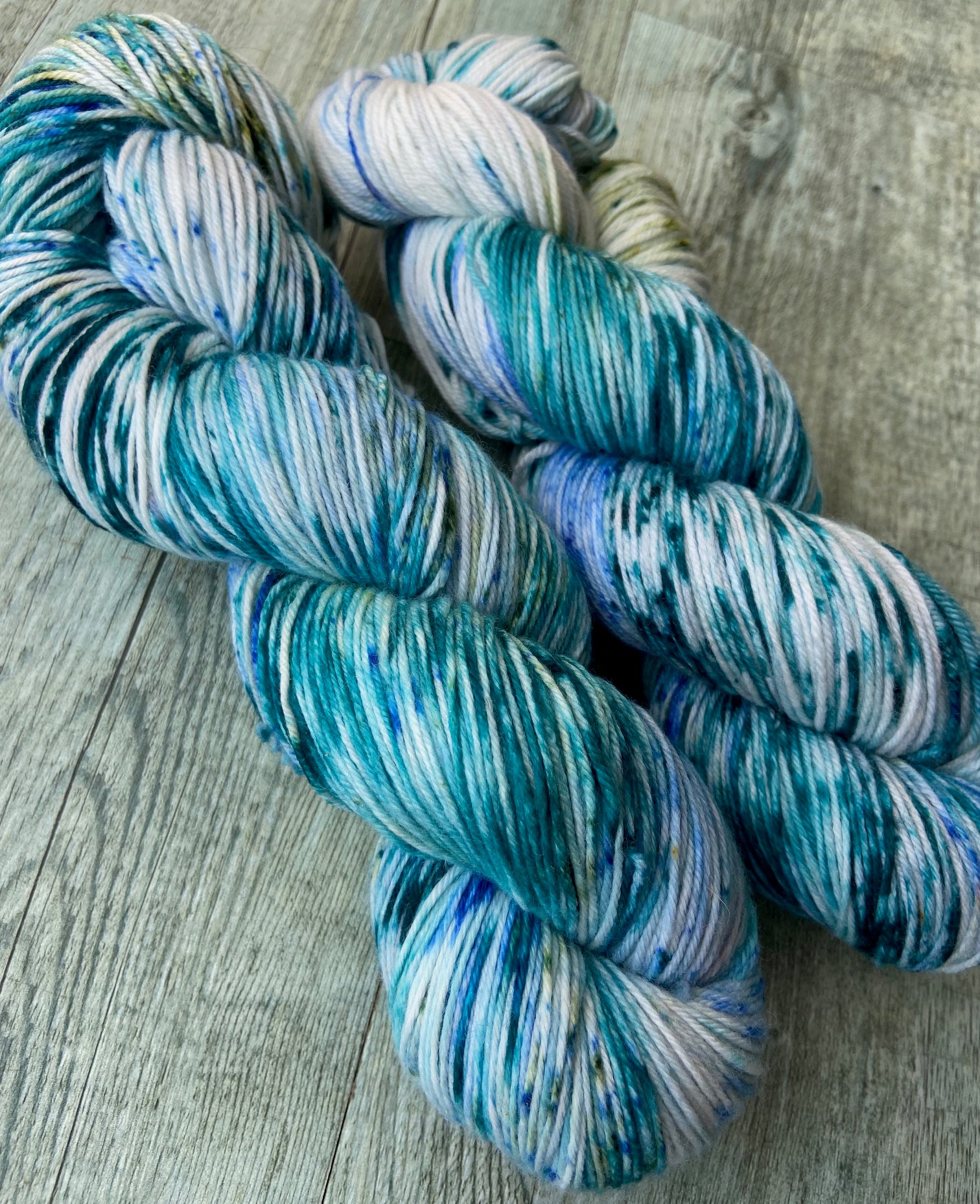 Beautifully Speckled Blue, White and marine coloured yarn in 4ply/sock weight with a hint of nylon for structure
