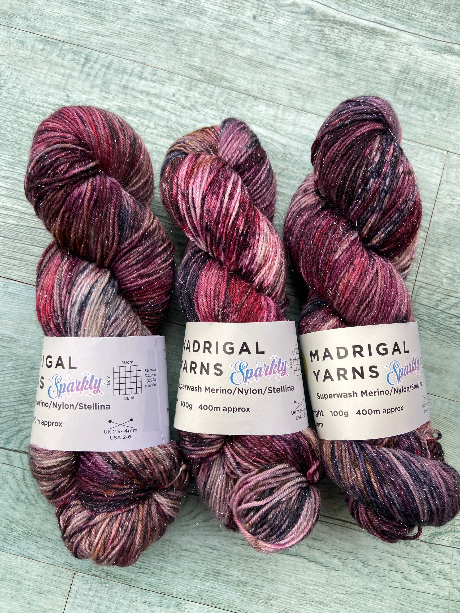 One of the colours from the Butterflye collection of yarns, this gorgeous colourway brings moody black and grey shades into ta rich burgundy and silver.