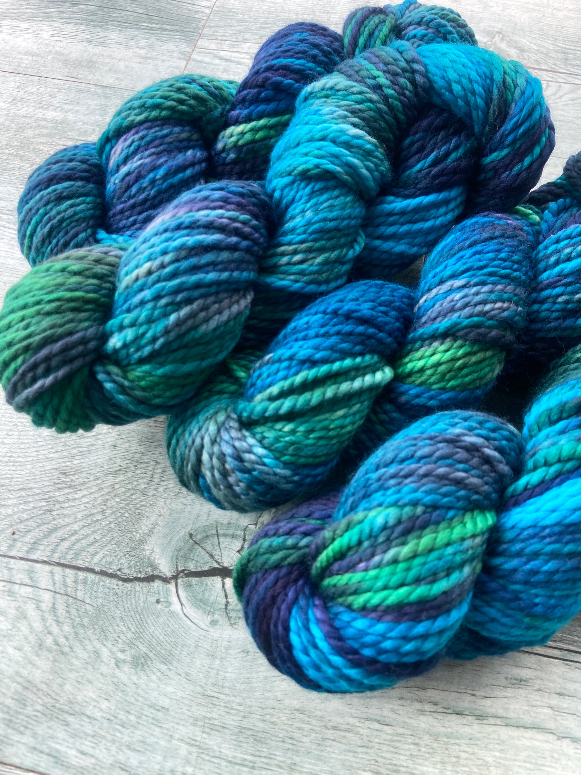 Produced in super soft, New Merino, this yarn is delightful to work with and produces a beautiful mottled fabric with the predominant colour of turquoise and mint with threads of green and turquoise.