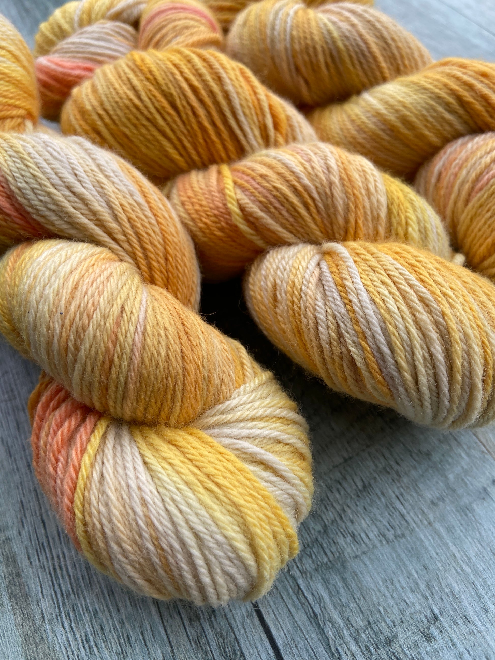 Produced in super soft merino, this yarn is delightful to work with and produces a beautiful mottled fabric with the predominant colour of yellows and white..