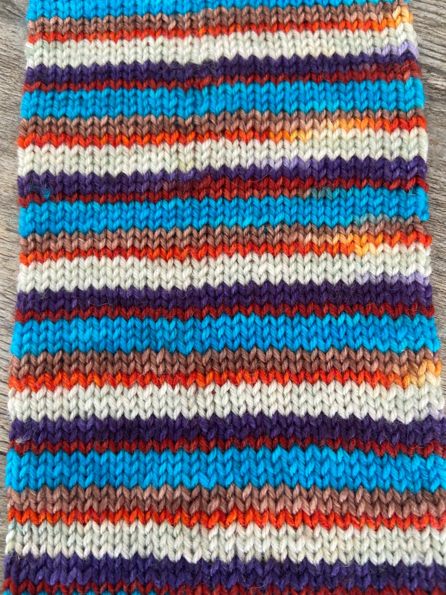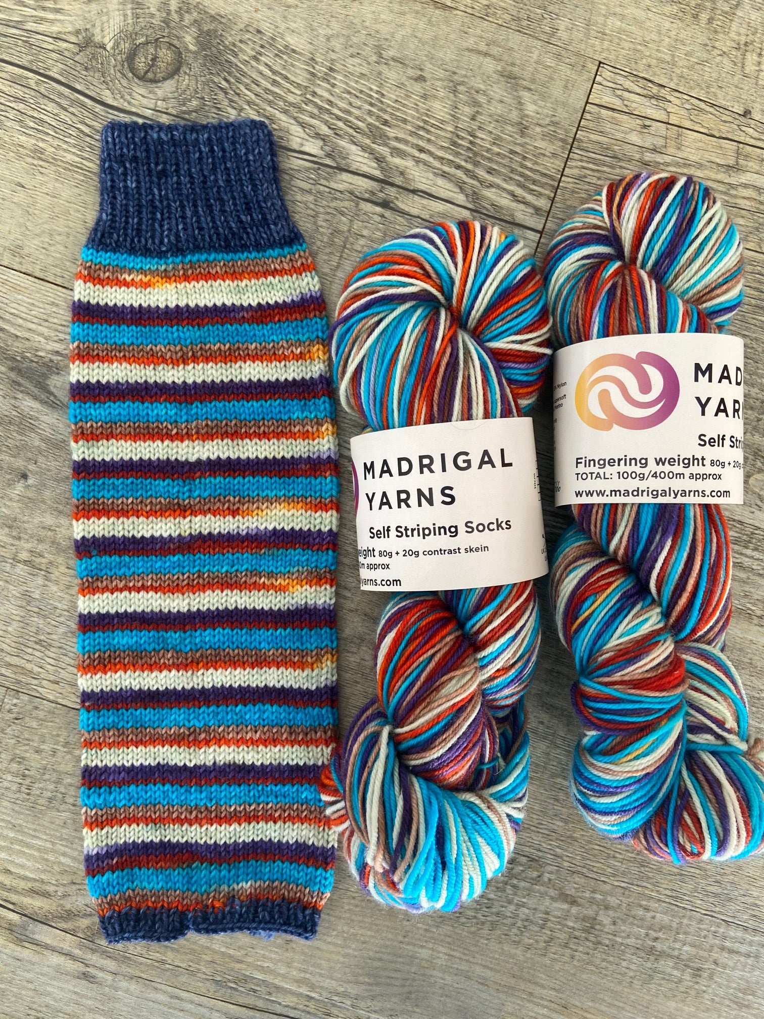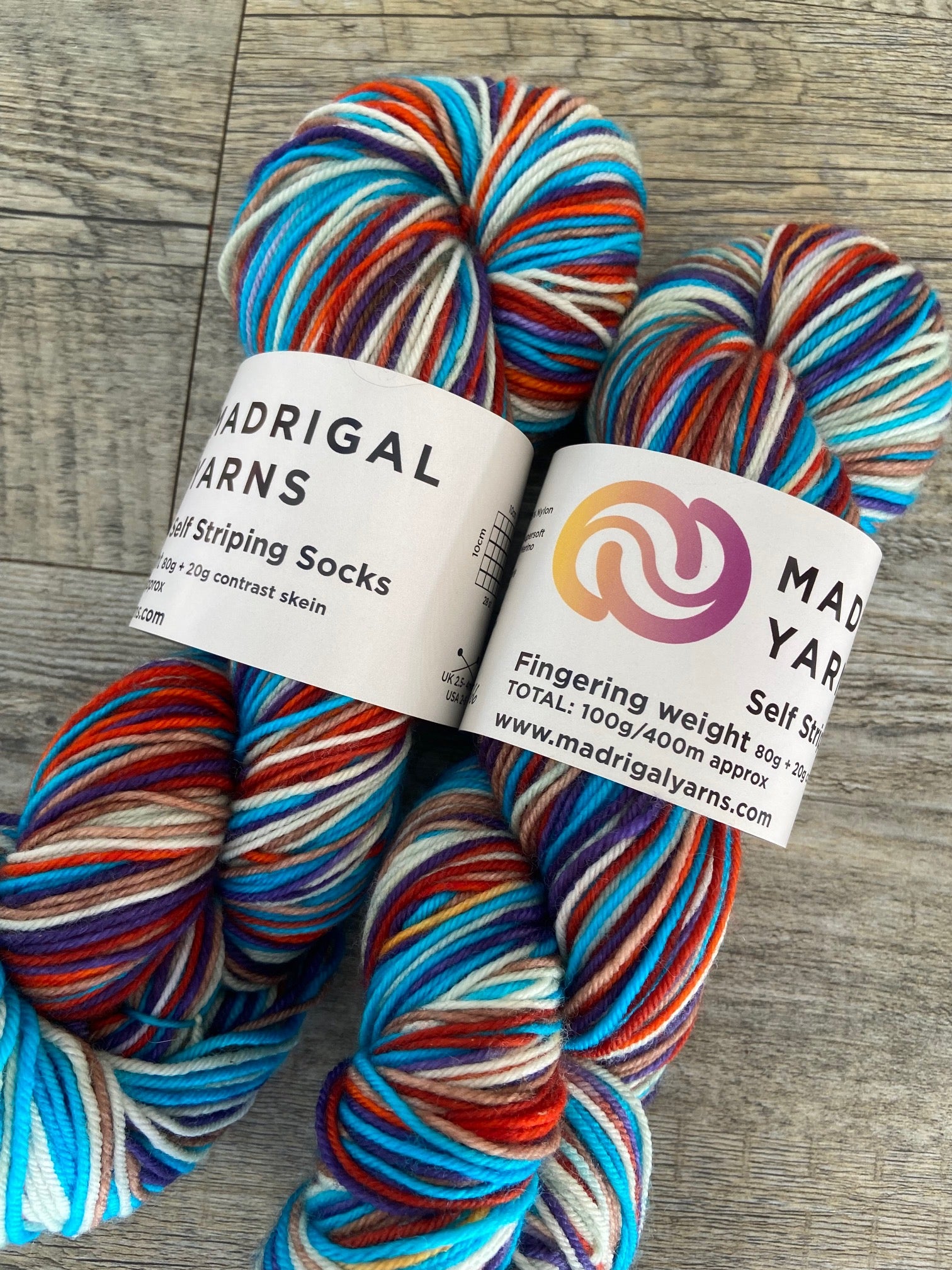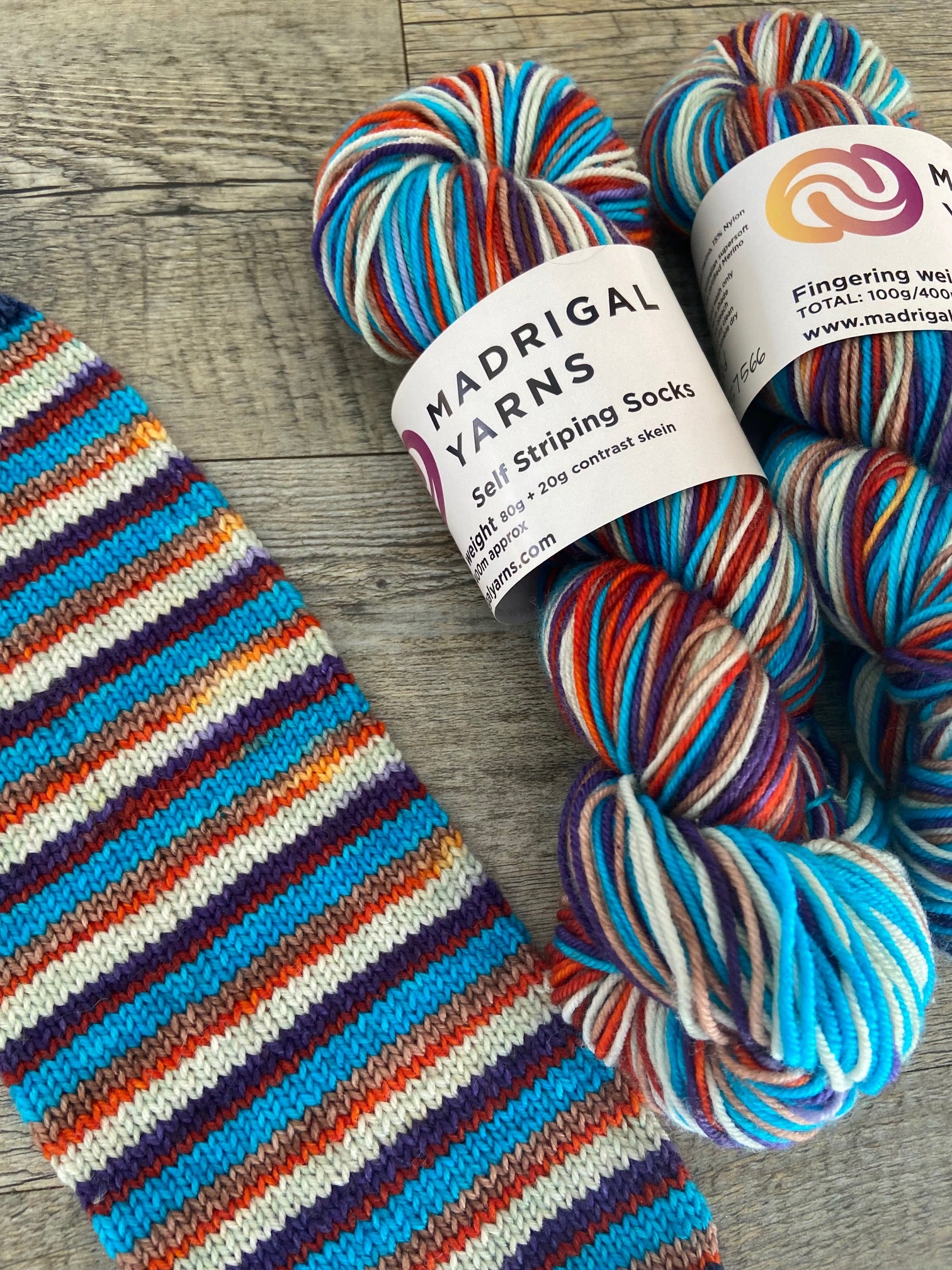 Each unit contains 80g of striping sock yarn - enough yarn to make 2 medium sized long socks. For optimal stripe, we recommend you use 2.5mm needles with typically 56 - 60 stitches. The yarn will yeild 30 pattern repeats, enough for 16 on each sock. The product also Includes 20g of a complementary colour for the Cuff-heel-toe detail should you want to snazzy the whole thing up. Total weight 100g.