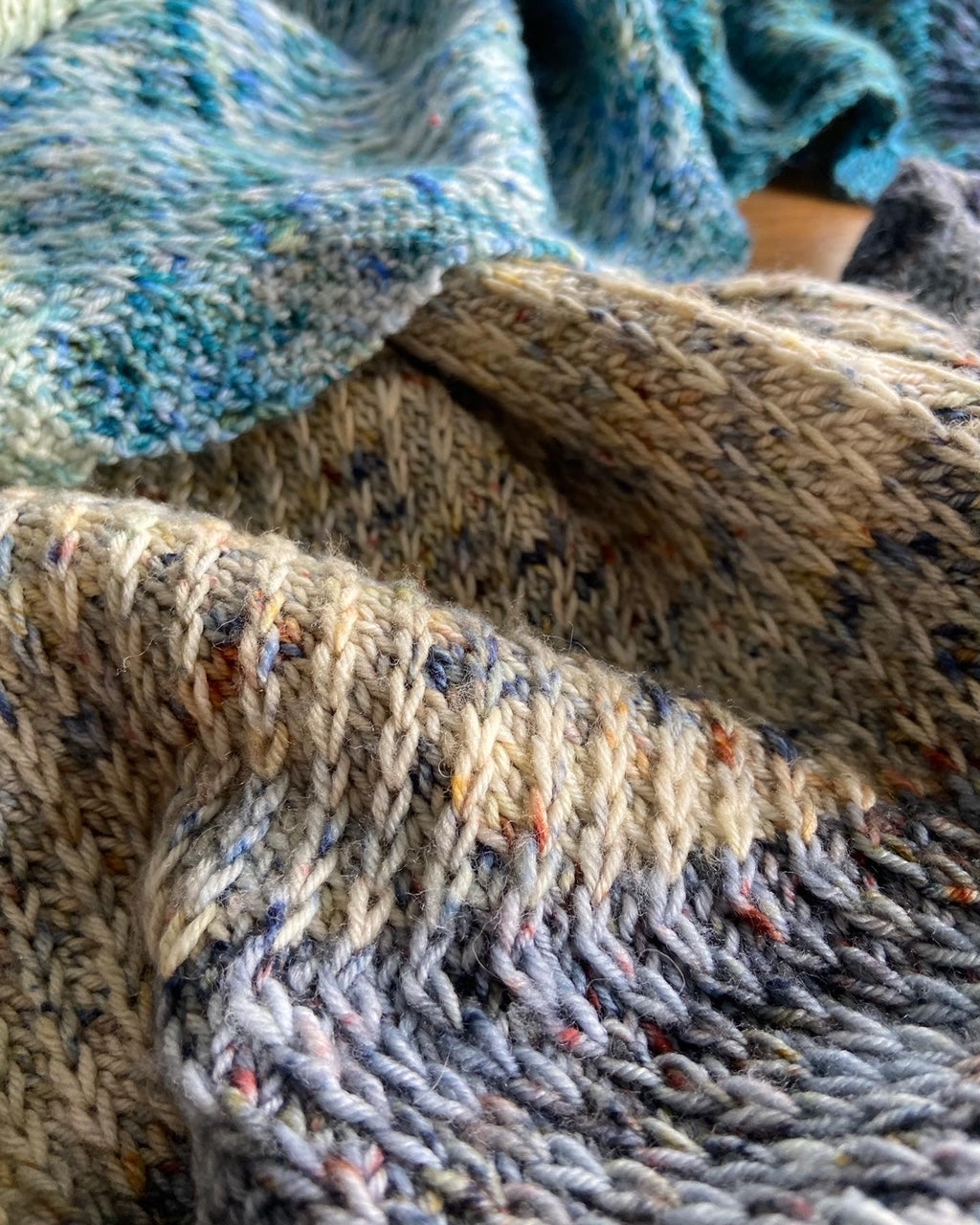 This is a shawl that is inspired by the ripples of the tidal waters on the tidal pools that I spent my entire childhood exploring. Granite geology is rare in Australia but here there is all sorts of amazing geology and flora that comes from the Granite.